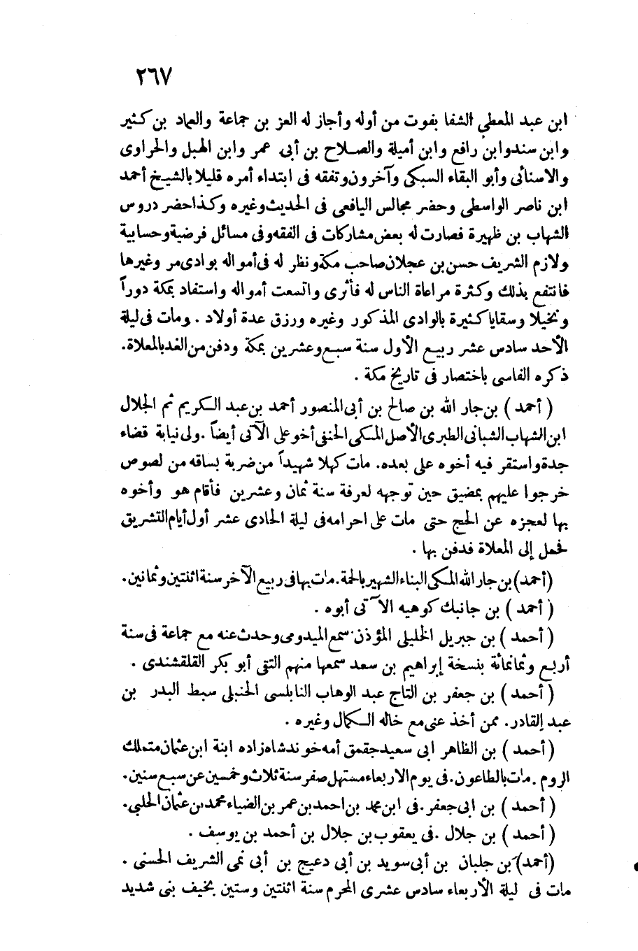 بن عبد الْمُعْطِي الشفا بفوت من أَوله وَأَجَازَ لَهُ الْعِزّ بن جمَاعَة والعماد بن كثير وَابْن سَنَد وَابْن رَافع وَابْن أميلة وَالصَّلَاح بن أبي عمر وَابْن الهبل والحراوي والأسنائي وَأَبُو الْبَقَاء السُّبْكِيّ وَآخَرُونَ وتفقه فِي ابْتِدَاء أمره قَلِيلا بالشيخ أَحْمد بن نَاصِر الوَاسِطِيّ وَحضر مجَالِس اليافعي فِي الحَدِيث وَغَيره وَكَذَا حضر دروس الشهَاب بن ظهيرة فَصَارَت لَهُ بعض مشاركات فِي الْفِقْه وَفِي مسَائِل فَرضِيَّة وحسابية ولازم الشريف حسن بن عجلَان صَاحب مَكَّة وَنظر لَهُ فِي أَمْوَاله بوادي مرو غَيرهَا فأنتفع بذلك وَكَثْرَة مُرَاعَاة النَّاس لَهُ فأثرى واتسعت أَمْوَاله واستفاد بِمَكَّة دورا ونخيلا وسقايا كَثِيرَة بالوادي الْمَذْكُور وَغَيره ورزق عدَّة أَوْلَاد. وَمَات فِي لَيْلَة الْأَحَد سادس عشر بيع الأول سنة سبع وَعشْرين بِمَكَّة وَدفن من الْغَد بالمعلاة. ذكره الفاسي بِاخْتِصَار فِي تَارِيخ مَكَّة.