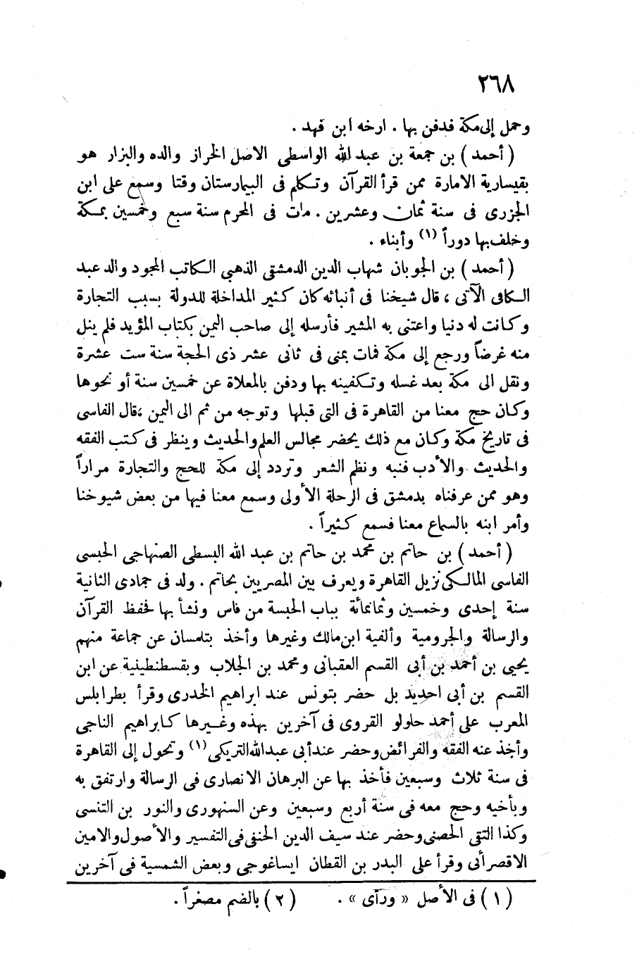 أَحْمد بن الجوبان شهَاب الدّين الدِّمَشْقِي الذَّهَبِيّ الْكَاتِب المجود وَالِد عبد الْكَافِي الْآتِي، / قَالَ شَيخنَا فِي أنبائه كَانَ كثير المداخلة للدولة بِسَبَب التِّجَارَة وَكَانَت لَهُ دنيا واعتنى بِهِ المشير فَأرْسلهُ إِلَى صَاحب الْيمن بِكِتَاب الْمُؤَيد فَلم ينل مِنْهُ غَرضا وَرجع إِلَى مَكَّة فَمَاتَ بمنى فِي ثَانِي ذِي الْحجَّة سنة سِتّ عشرَة وَنقل إِلَى مَكَّة بعد غسله وتكفينه بهَا وَدفن بالمعلاة عَن خمسين سنة أَو نَحْوهَا وَكَانَ حج مَعنا من الْقَاهِرَة فِي الَّتِي قبلهَا وَتوجه من ثمَّ إِلَى الْيمن، قَالَ الفاسي فِي تَارِيخ مَكَّة وَكَانَ مَعَ ذَلِك يحضر مجَالِس الْعلم والْحَدِيث وَينظر فِي كتب الْفِقْه والْحَدِيث وَالْأَدب فنبه ونظم الشّعْر وَتردد إِلَى مَكَّة لِلْحَجِّ وَالتِّجَارَة مرَارًا وَهُوَ مِمَّن عَرفْنَاهُ بِدِمَشْق فِي الرحلة الأولى وَسمع مَعنا فِيهَا من بعض شُيُوخنَا وَأمر ابْنه بِالسَّمَاعِ مَعنا فَسمع كثيرا.