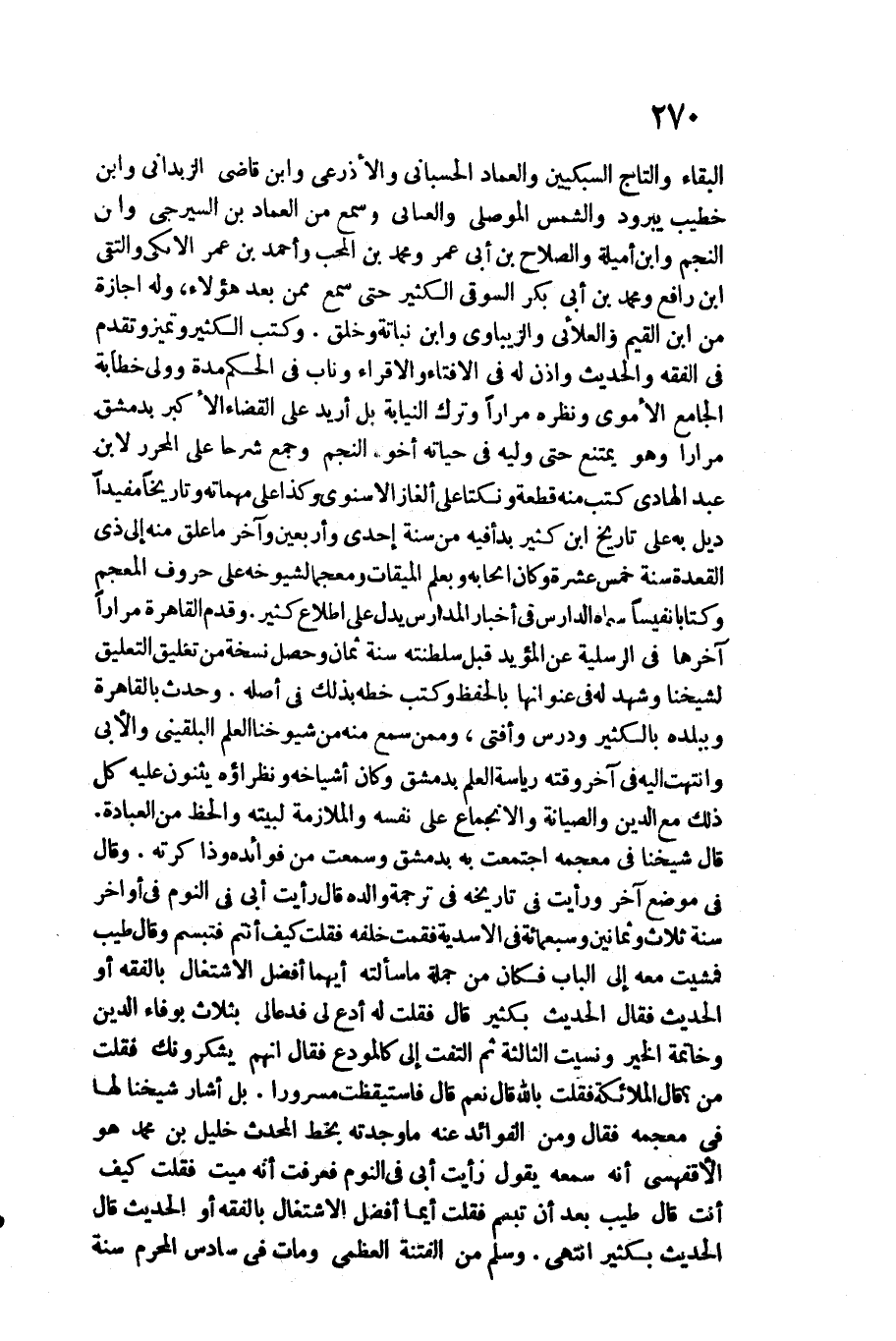 الْبَقَاء والتاج السبكيين والعماد الحسباني والأذرعي وَابْن قَاضِي الزبداني وَابْن خطيب يبرود وَالشَّمْس الْموصِلِي والعنابي وَسمع من الْعِمَاد بن السيرجي وَابْن النَّجْم وَابْن أميلة وَالصَّلَاح بن أبي عمر وَمُحَمّد بن الْمُحب وَأحمد بن عمر الأبكي والتقي بن رَافع وَمُحَمّد بن أبي بكر السوقي الْكثير حَتَّى سمع مِمَّن بعد هَؤُلَاءِ، وَله إجَازَة من ابْن الْقيم والعلائي والزيباوي وَابْن نباتة وَخلق. وَكتب الْكثير وتميز وَتقدم فِي الْفِقْه والْحَدِيث وَأذن لَهُ فِي الْإِفْتَاء والإقراء وناب فِي الحكم مُدَّة وَولي خطابة الْجَامِع الْأمَوِي وَنَظره مرَارًا وَترك النِّيَابَة بل أُرِيد على الْقَضَاء الْأَكْبَر بِدِمَشْق مرَارًا وَهُوَ يمْتَنع حَتَّى وليه فِي حَيَاته أَخُوهُ النَّجْم وَجمع شرحا على الْمُحَرر لِابْنِ عبد الْهَادِي كتب مِنْهُ قِطْعَة ونكتا على ألغاز الأسنوي وَكَذَا على مهماته وتاريخا مُفِيدا ديل بِهِ على تَارِيخ ابْن كثير بَدَأَ فِيهِ من سنة إِحْدَى وَأَرْبَعين وَآخر مَا علق مِنْهُ إِلَى ذِي الْقعدَة سنة خمس عشرَة وَكَانَ انحابه وبعلم الْمِيقَات ومعجما لشيوخه على حُرُوف المعجم وكتابا نفيسا سَمَّاهُ الدارس فِي أَخْبَار الْمدَارِس يدل على اطلَاع كثير. وَقدم الْقَاهِرَة مرَارًا آخرهَا فِي الرسلية عَن الْمُؤَيد قبل سلطنته سنة ثَمَان وَحصل نُسْخَة من تَعْلِيق التَّعَلُّق لشَيْخِنَا وَشهد لَهُ فِي عنوانها بِالْحِفْظِ وَكتب خطه بذلك فِي أَصله. وَحدث بِالْقَاهِرَةِ وببلده بالكثير ودرس وَأفْتى، وَمِمَّنْ سمع مِنْهُ من شُيُوخنَا الْعلم البُلْقِينِيّ والأبي وانتهت إِلَيْهِ فِي آخر وقته رياسة الْعلم بِدِمَشْق وَكَانَ أشياخه ونظراؤه يثنون عَلَيْهِ كل ذَلِك مَعَ الدّين والصيانة والانجماع على نَفسه والملازمة لبيته والحظ من الْعِبَادَة. قَالَ شَيخنَا فِي مُعْجَمه اجْتمعت بِهِ بِدِمَشْق وَسمعت من فَوَائده وذاكرته. وَقَالَ فِي مَوضِع آخر وَرَأَيْت فِي تَارِيخه فِي تَرْجَمَة وَالِده قَالَ رَأَيْت أبي فِي النّوم فِي أَوَاخِر سنة ثَلَاث وَثَمَانِينَ وَسَبْعمائة فِي الأَسدِية فَقُمْت خَلفه فَقلت)