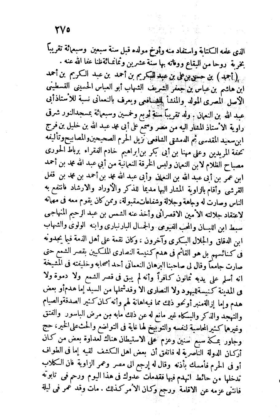 أَحْمد بن حسن بن عَليّ بن عبد الْكَرِيم بن أَحْمد بن عبد الْكَرِيم بن أَحْمد بن هَاشم بن بعاس ابْن جَعْفَر الشريف الشهَاب أَبُو الْعَبَّاس الْحُسَيْنِي القسطيني الأَصْل الْمصْرِيّ المولد والمنشأ الشَّافِعِي وَيعرف بالنعماني / نِسْبَة للأستاذ أبي عبد الله بن النُّعْمَان. ولد تَقْرِيبًا سنة أَربع وَخمسين وَسَبْعمائة بِمَسْجِد النُّور شَرْقي راوية الْأُسْتَاذ الْمشَار إِلَيْهِ من مصر وَسمع على أبي مُحَمَّد عبد الله بن خَلِيل بن فرج بن سعيد الْمَقْدِسِي ثمَّ الدِّمَشْقِي الشَّافِعِي نزل الْحرم الصَّحِيحَيْنِ والمصابيح وتأليفه تحفة المريدين وعَلى مهنا بن أبي بكر بن إِبْرَاهِيم خَادِم الْفُقَرَاء برباط الحوري مِصْبَاح الظلام لِابْنِ النُّعْمَان وَلبس الْخِرْقَة النعمانية من أبي عبد الله مُحَمَّد بن أَحْمد بن عمر بن أبي عبد الله بن النُّعْمَان وَأبي عبد الله مُحَمَّد بن أَحْمد بن مُحَمَّد بن قفل الْقرشِي وَأقَام بالزاوية الْمشَار إِلَيْهَا مديما للذّكر والأوراد والإرشاد فَانْتَفع بِهِ النَّاس وَصَارَت لَهُ وجاهة وجلالة وشفاعات مَقْبُولَة، وَمِمَّنْ كَانَ يقوم مَعَه فِي مهماته لاعتقاد جلالته الْأمين الأقصرائي وَأخذ عَنهُ الشَّمْس بن عبد الرَّحِيم المنهاجي سبط ابْن اللبان والمحب الفيومي وَالْجمال البارنباري وَابْنه الولوي والشهاب بن الدقاق والجلال الْبكْرِيّ وَآخَرُونَ، وَكَانَ نقمة على أهل الذِّمَّة فِيمَا يجدونه فِي كنائسهم بل هُوَ الْقَائِم فِي هدم كَنِيسَة النَّصَارَى الملكيين بقصر الشمع حَتَّى صَارَت جَامعا وَقَالَ لي صاحبنا الْبُرْهَان النعماني أحد أَصْحَابه وخليفته فِي المشيخة أَنه أسلم على يَدَيْهِ ثَمَانُون كَافِرًا وَأَنه لم يبْق فِي قصر الشمع وَلَا دموة وَلَا فِي الْمَدِينَة كَنِيسَة للْيَهُود وَلَا النَّصَارَى إِلَّا وَقد شملها من السَّيِّد إِمَّا هدم أَو بعض هدم وَإِمَّا إِزَالَة مِنْبَر أَو نَحْو ذَلِك مِمَّا فِيهِ إهانة لَهُم وَأَنه كَانَ كثير الصَّدَقَة وَالصِّيَام والتهجد وَالذكر والبكاء غير مَانع لَهُ عَن ذَلِك مَا بِهِ من مرض الْبَاسُور)