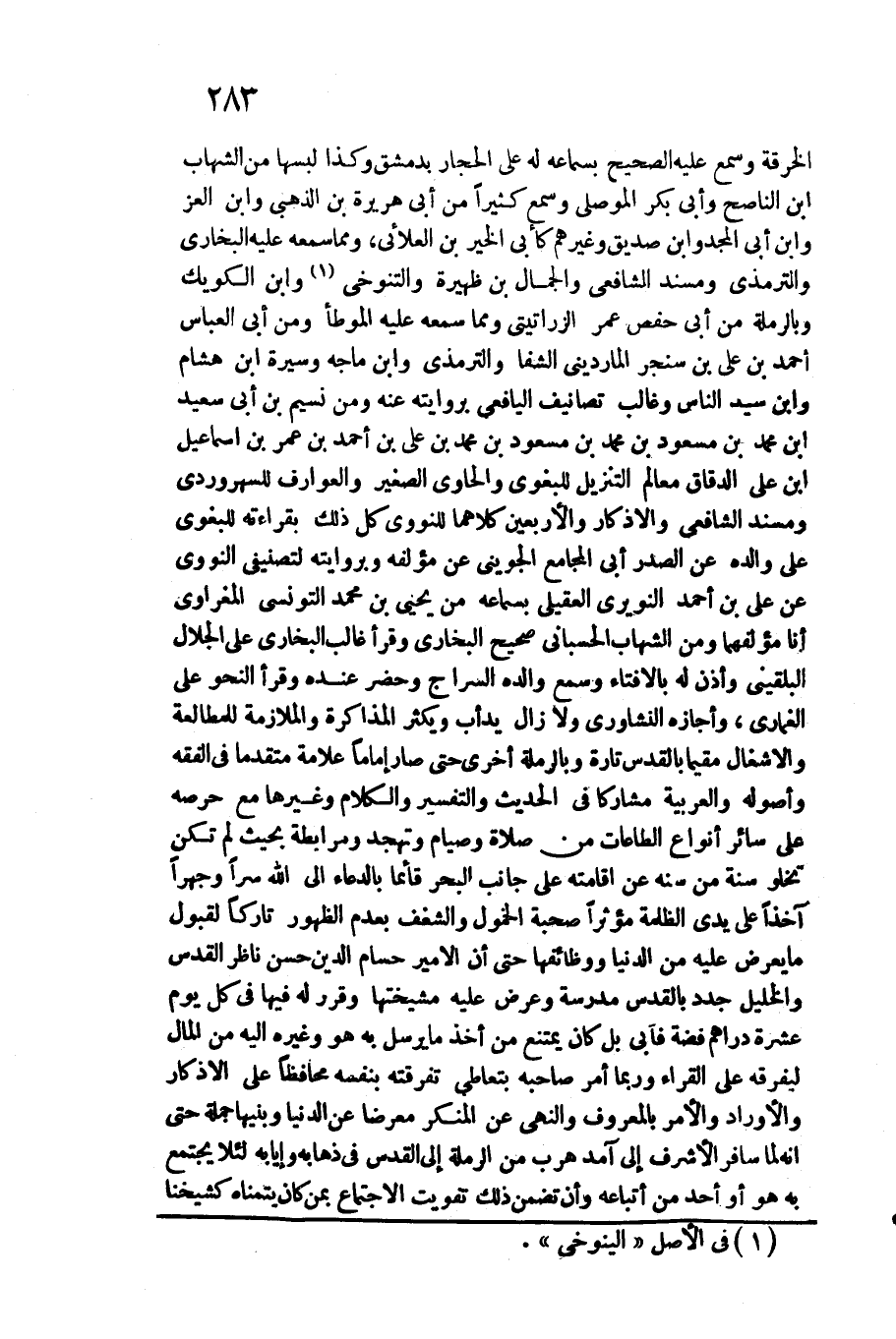 الْخِرْقَة وَسمع عَلَيْهِ الصَّحِيح بِسَمَاعِهِ لَهُ على الحجار بِدِمَشْق وَكَذَا لبسهَا من الشهَاب ابْن الناصح وَأبي بكر الْموصِلِي وَسمع كثيرا من أبي هُرَيْرَة بن الذَّهَبِيّ وَابْن الْعِزّ وَابْن أبي الْمجد وَابْن صديق وَغَيرهم كَأبي الْخَيْر بن العلائي، وَمِمَّا سَمعه عَلَيْهِ البُخَارِيّ وَالتِّرْمِذِيّ ومسند الشَّافِعِي وَالْجمال بن ظهيرة والتنوخي وَابْن الكويك وبالرملة من أبي حَفْص عمر الزراتيتي وَمِمَّا سَمعه عَلَيْهِ الْمُوَطَّأ وَمن أبي الْعَبَّاس أَحْمد بن عَليّ بن سنجر المارديني الشفا وَالتِّرْمِذِيّ وَابْن مَاجَه وسيرة ابْن هِشَام وَابْن سيد النَّاس وغالب تصانيف اليافعي بروايته عَنهُ من نسيم بن أبي سعيد بن مُحَمَّد بن مَسْعُود بن مُحَمَّد بن مَسْعُود بن مُحَمَّد بن عَليّ بن أَحْمد بن عمر بن إِسْمَاعِيل بن عَليّ الدقاق معالم التَّنْزِيل لِلْبَغوِيِّ وَالْحَاوِي الصَّغِير والعوارف للسهروردي ومسند الشَّافِعِي والأذكار وَالْأَرْبَعِينَ كِلَاهُمَا للنووي كل ذَلِك بقرَاءَته لِلْبَغوِيِّ على وَالِده عَن الصَّدْر أبي المجامع الْجُوَيْنِيّ عَن مُؤَلفه وبروايته لتصنيفي النَّوَوِيّ عَن عَليّ بن أَحْمد النويري الْعقيلِيّ بِسَمَاعِهِ من يحيى بن مُحَمَّد التّونسِيّ المغراوي أَنا مؤلفهما وَمن الشهَاب الحسباني صَحِيح البُخَارِيّ وَقَرَأَ غَالب البُخَارِيّ على الْجلَال البُلْقِينِيّ وَأذن لَهُ بالإفتاء وَسمع وَالِده السراج وَحضر عِنْده وَقَرَأَ النَّحْو على الغماري، وَأَجَازَهُ النشاوري وَلَا زَالَ يدأب وَيكثر المذاكرة والملازمة للمطالعة والأشغال مُقيما بالقدس تَارَة وبالرملة أُخْرَى حَتَّى صَار إِمَامًا عَلامَة مُتَقَدما فِي الْفِقْه وأصوله والعربية مشاركا فِي الحَدِيث وَالتَّفْسِير وَالْكَلَام وَغَيرهَا مَعَ حرصه على سَائِر أَنْوَاع الطَّاعَات من صَلَاة وَصِيَام وتهجد ومرابطة بِحَيْثُ لم تكن تَخْلُو سنة من سنه عَن إِقَامَته على جَانب الْبَحْر قَائِما بِالدُّعَاءِ إِلَى الله سرا وجهرا آخِذا على يَدي الظلمَة مؤثرا صُحْبَة الخمول والشغف بِعَدَمِ الظُّهُور تَارِكًا لقبُول مَا يعرض عَلَيْهِ من الدُّنْيَا ووظائفها حَتَّى أَن الْأَمِير حسام الدّين حسن نَاظر الْقُدس والخليل جدد بالقدس مدرسة وَعرض عَلَيْهِ مشيختها وَقرر لَهُ فِيهَا فِي كل يَوْم عشرَة دَرَاهِم فضَّة فَأبى بل كَانَ يمْتَنع من أَخذ مَا يُرْسل بِهِ هُوَ وَغَيره إِلَيْهِ من المَال ليفرقه على الْقُرَّاء وَرُبمَا أَمر صَاحبه بتعاطي تفرقته بِنَفسِهِ محافظا على الْأَذْكَار والأوراد وَالْأَمر بِالْمَعْرُوفِ وَالنَّهْي عَن الْمُنكر معرضًا عَن الدُّنْيَا وبنيها جملَة حَتَّى أَنَّهَا لما سَافر الْأَشْرَف إِلَى آمد هرب من الرملة إِلَى الْقُدس فِي ذَهَابه وإيابه لِئَلَّا يجْتَمع بِهِ هُوَ)