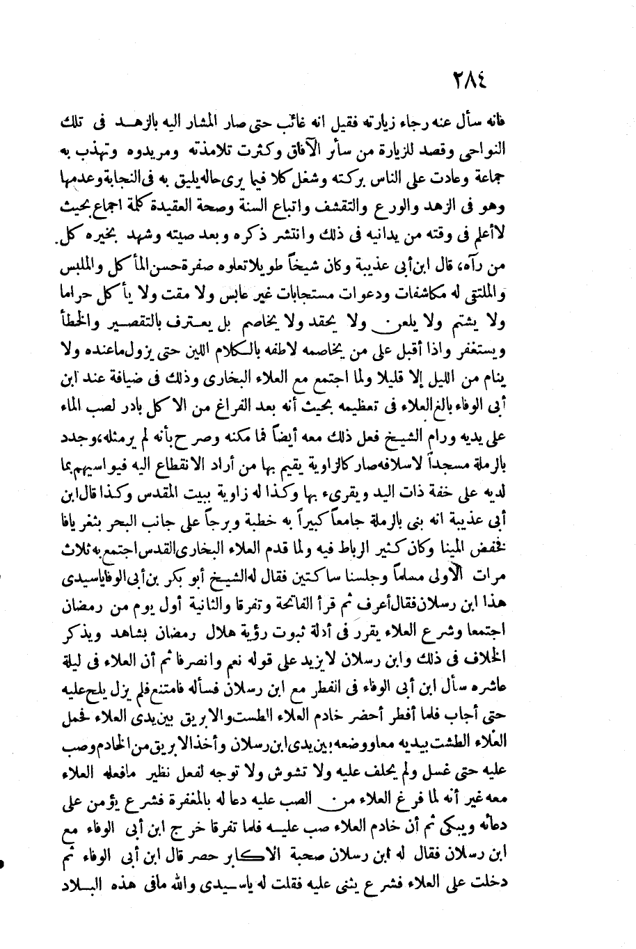 فَإِنَّهُ سَأَلَ عَنهُ رَجَاء زيارته فَقيل أَنه غَائِب حَتَّى صَار الْمشَار إِلَيْهِ بالزهد فِي تِلْكَ النواحي وَقصد للزيارة من سَائِر الْآفَاق وَكَثُرت تلامذته ومريدوه وتهذب بِهِ جمَاعَة وعادت على النَّاس بركته وشغل كلا فِيمَا يرى حَاله يَلِيق بِهِ فِي النجابة وَعدمهَا وَهُوَ فِي الزّهْد والورع والتقشف وَاتِّبَاع السّنة وَصِحَّة العقيدة كلمة إِجْمَاع بِحَيْثُ لَا أعلم فِي وقته من يدانيه فِي ذَلِك وانتشر ذكره وَبعد وحيته وَشهد بخيره كل من رَآهُ، قَالَ ابْن أبي عذيبة وَكَانَ شَيخا طَويلا تعلوه صفرَة حسن المأكل والملبس والملتقى لَهُ مكاشفات ودعوات مستجابات غير عَابس وَلَا مقت وَلَا يَأْكُل حَرَامًا وَلَا يشْتم وَلَا يلعن وَلَا يحقد وَلَا يُخَاصم بل يعْتَرف بالتقصير وَالْخَطَأ ويستغفر وَإِذا أقبل على من يخاصمه لاطفه بالْكلَام اللين حَتَّى يَزُول مَا عِنْده وَلَا ينَام من اللَّيْل إِلَّا قَلِيلا وَلما اجْتمع مَعَ الْعَلَاء البُخَارِيّ وَذَلِكَ فِي ضِيَافَة عِنْد ابْن أبي الْوَفَاء بَالغ الْعَلَاء فِي تَعْظِيمه بِحَيْثُ أَنه بعد الْفَرَاغ من الْأكل بَادر لصب المَاء على يَدَيْهِ ورام الشَّيْخ فعل ذَلِك مَعَه أَيْضا فَمَا مكنه وَصرح بانه لم ير مثله، وجدد بالرملة مَسْجِدا لأسلافه صَار كالزاوية يُقيم بهَا من أَرَادَ الِانْقِطَاع إِلَيْهِ فيواسيهم بِمَا لَدَيْهِ على خفَّة ذَات الْيَد ويقرئ بهَا وَكَذَا لَهُ زَاوِيَة بِبَيْت الْمُقَدّس وَكَذَا قَالَ ابْن أبي عذيبة أَنه بنى بالرملة جَامعا كَبِيرا بِهِ خطْبَة وبرجا على جَانب الْبَحْر بثغر يافا فخفض المينا وَكَانَ كثير الرِّبَاط فِيهِ وَلما قدم الْعَلَاء البُخَارِيّ الْقُدس اجْتمع بِهِ ثَلَاث مَرَّات الأولى مُسلما وَجَلَسْنَا ساكتين فَقَالَ لَهُ الشَّيْخ أَبُو بكر بن أبي الوفا يَا سَيِّدي هَذَا ابْن رسْلَان فَقَالَ أعرف ثمَّ قَرَأَ الْفَاتِحَة وتفرقا وَالثَّانيَِة أول يَوْم من رَمَضَان اجْتمعَا وَشرع الْعَلَاء يُقرر فِي أَدِلَّة ثُبُوت رُؤْيَة هِلَال رَمَضَان بِشَاهِد وَيذكر الْخلاف فِي ذَلِك وَابْن رسْلَان لَا يزِيد على قَوْله نعم وانصرفا ثمَّ أَن الْعَلَاء فِي لَيْلَة عاشره سَأَلَ ابْن أبي الْوَفَاء فِي الْفطر مَعَ ابْن رسْلَان فَسَأَلَهُ فَامْتنعَ فَلم يزل يلح عَلَيْهِ حَتَّى أجَاب فَلَمَّا أفطر أحضر خَادِم الْعَلَاء الطست والإبريق بَين يَدي الْعَلَاء فَحمل الْعَلَاء الطشت بيدَيْهِ مَعًا وَوَضعه بَين يَدي ابْن رسْلَان وَأخذ الإبريق من الْخَادِم وصب عَلَيْهِ حَتَّى غسل وَلم يحلف عَلَيْهِ وَلَا تشوش وَلَا توجه لفعل نَظِير مَا فعله الْعَلَاء مَعَه غير أَنه لما فرغ الْعَلَاء من الصب عَلَيْهِ دَعَا لَهُ بالمغفرة فشرع يُؤمن على دُعَائِهِ ويبكي ثمَّ أَن خَادِم الْعَلَاء صب عَلَيْهِ فَلَمَّا تفَرقا خرج ابْن أبي الْوَفَاء مَعَ ابْن رسْلَان فَقَالَ لَهُ ابْن رسْلَان صُحْبَة الأكابر حصر قَالَ ابْن أبي لوفاء ثمَّ دخلت على الْعَلَاء فشرع يثني عَلَيْهِ فَقلت لَهُ يَا)