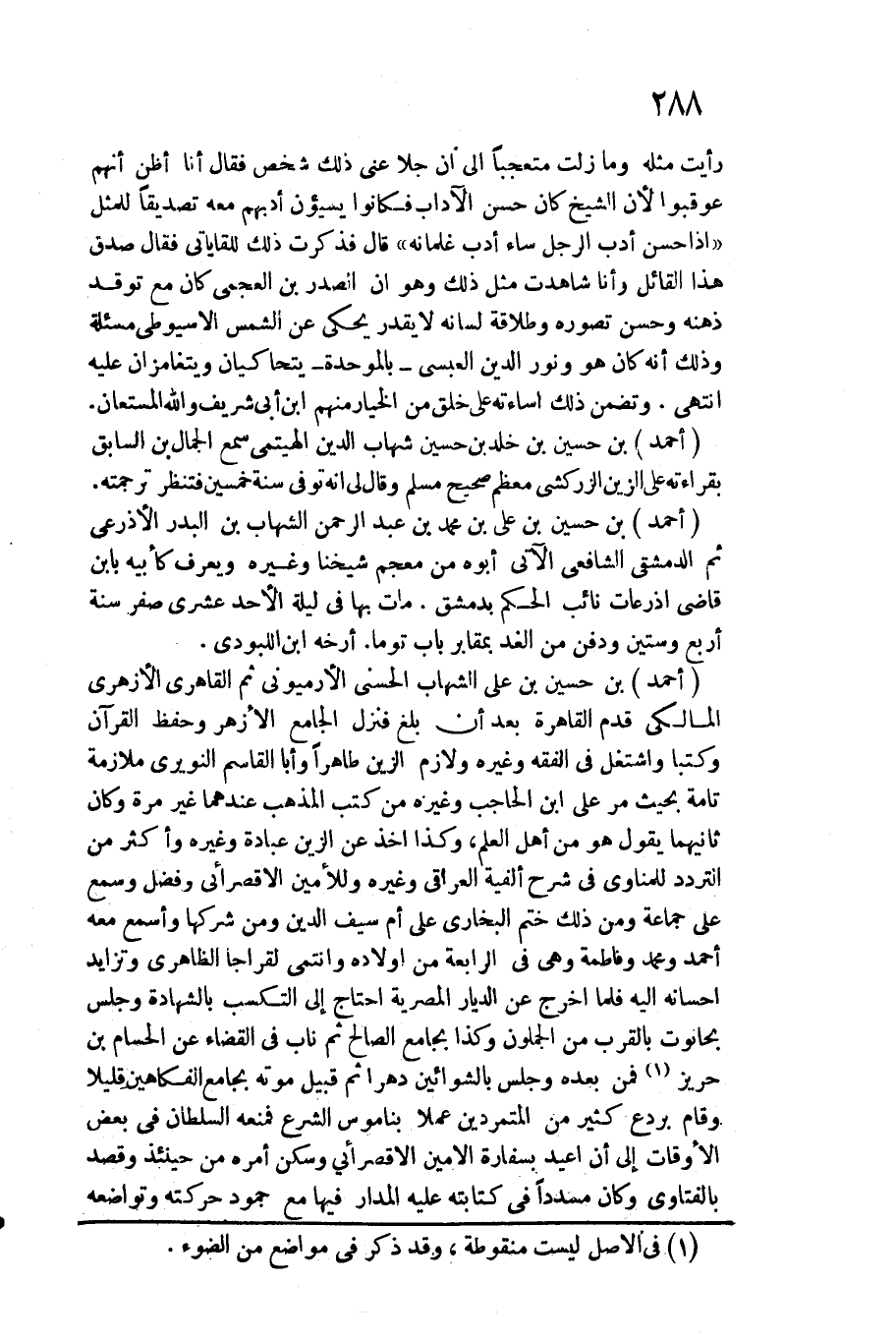 رَأَيْت مثله وَمَا زلت مُتَعَجِّبا إِلَى أَن جلا عني ذَلِك شخص فَقَالَ أَنا أَظن أَنهم عوقبوا لِأَن الشَّيْخ كَانَ حسن الْآدَاب فَكَانُوا يسيؤون أدبهم مَعَه تَصْدِيقًا للمثل إِذا حسن أدب الرجل سَاءَ أدب غلمانه قَالَ فَذكرت ذَلِك للقاياتي فَقَالَ صدق هَذَا الْقَائِل وَأَنا شاهدت مثل ذَلِك وَهُوَ أَن الصَّدْر بن العجمي كَانَ مَعَ توقد ذهنه وَحسن تصَوره وطلاقة لِسَانه لَا يقدر يَحْكِي عَن الشَّمْس الأسيوطي مَسْأَلَة وَذَلِكَ أَنه كَانَ هُوَ وَنور الدّين الْعَبْسِي بِالْمُوَحَّدَةِ يتحاكيان ويتغامزان عَلَيْهِ انْتهى. وتضمن ذَلِك إساءته على خلق من الْخِيَار مِنْهُم ابْن أبي شرِيف وَالله الْمُسْتَعَان.