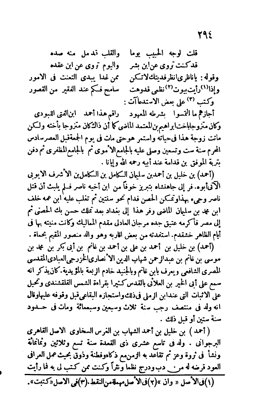 أَحْمد بن خَلِيل بن أَحْمد بن سُلَيْمَان الْكَامِل بن الْكَامِل بن الْأَشْرَف الأيوبي الْآتِي أَبوهُ. / فر إِلَى جاهنشاه بتبريز خوفًا من ابْن أَخِيه نَاصِر فَلم يلبث أَن قتل نَاصِر جِيءَ بِهَذَا وَتمكن الْحصن فدام نَحْو سنتَيْن ثمَّ تغلب عَلَيْهِ ابْن عَمه خلف بن مُحَمَّد بن سُلَيْمَان الْمَاضِي وفر هَذَا إِلَى بَغْدَاد بعد تملك حسن بك الحصني ثمَّ إِلَى مصر فَأكْرمه عَتيق جده مرجان العادلي مقدم المماليك وَكَانَت منيته بهَا فِي أَيَّام الظَّاهِر خشقدم. استفدته من بعض أَقَاربه وَهُوَ وَالِد مَنْصُور الْمُقِيم بحماة.