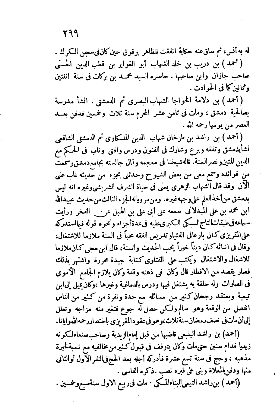 أَحْمد بن رَاشد بن طرخان شهَاب الدّين الملكاوي ثمَّ الدِّمَشْقِي الشَّافِعِي / نَشأ بِدِمَشْق وتفقه وبرع وشارك فِي الْفُنُون ودرس وَأفْتى وناب فِي الحكم مَعَ الدّين المتين وَنصر السّنة. قَالَه شَيخنَا فِي مُعْجَمه وَقَالَ جالسته بِجَامِع دمشق وَسمعت من فَوَائده وَسمع معي من بعض الشُّيُوخ وحَدثني بِجُزْء من حَدِيثه غَابَ عني الْآن وَقد قَالَ الشهَاب الزُّهْرِيّ يَعْنِي فِي حَيَاة الشّرف الشريشي وَغَيره أَنه لَيْسَ بِدِمَشْق من أَخذ الْعلم على وَجهه غَيره. وَمن مروياته الْجُزْء الثَّالِث من حَدِيث عبيد الله بن مُحَمَّد بن عَليّ الميدلاني سَمعه على أبي عَليّ بن الهبل عَن الْفَخر وَرَأَيْت سَمَاعه فِي طَبَقَات التَّاج السُّبْكِيّ الْكُبْرَى عَلَيْهِ فِي عدَّة أَجزَاء وَنَحْوه قَوْله فِيمَا استدركه على المقريزي كَانَ بارعا فِي الْفتيا وتدريس الْفِقْه محبا فِي السّنة ملازما للاشتغال، وَقَالَ فِي أنبائه كَانَ دينا خيرا يحب الحَدِيث وَالسّنة، قَالَ ابْن حجي كَانَ ملازما للأشغال والاشتغال وَيكْتب على الْفَتَاوَى كِتَابَة جَيِّدَة محررة واشتهر بذلك فَصَارَ يقْصد من الأقطار قَالَ وَكَانَ فِي ذهنه وَقْفَة وَكَانَ يلازم الْجَامِع الْأمَوِي فِي الصَّلَوَات وَله حَلقَة بِهِ يشْتَغل فِيهَا ودرس بالدماغية وَغَيرهَا، وَكَانَ يمِيل إِلَى ابْن تَيْمِية ويعتقد رُجْحَان كثير من مسَائِله مَعَ حِدة ونفرة من كثير من النَّاس انْفَصل من الْوَقْعَة وَهُوَ سَالم وَلَكِن حصل لَهُ جوع فَتغير مِنْهُ مزاجه وتعلل إِلَى أَن مَاتَ فِي نصف رَمَضَان سنة ثَلَاث، وَهُوَ فِي عُقُود المقريزي بِاخْتِصَار رَحمَه الله وإيانا.