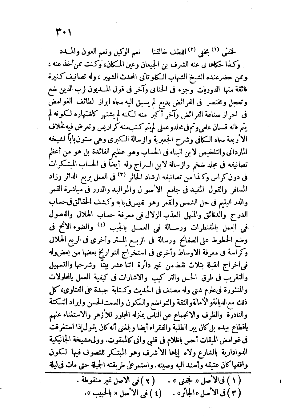 الحناني وَآخر فِي قَول الْمَدْيُون لرب الدّين ضع وتعجل ومختصر فِي الْفَرَائِض بديع لم يسْبق إِلَيْهِ سَمَّاهُ إبراز لطائف الغوامض فِي إِحْرَاز صناعَة الْفَرَائِض وَآخر أكبر مِنْهُ لكنه لم يشْتَهر كاشتهاره لكَونه لم يتم فَإِنَّهُ قِسْمَانِ علمي وَتمّ فِي مُجَلد وعملي لم يتم كتب مِنْهُ كراريس وَتعرض فِيهِ لخلاف الْأَرْبَعَة سَمَّاهُ الْكَافِي وَشرح الجعبرية والرسالة الْكُبْرَى وَهِي سِتُّونَ بَابا لشيخه المارداني وَالتَّلْخِيص لِابْنِ الْبناء فِي الْحساب وَهُوَ عَظِيم الْفَائِدَة بل هُوَ من أعظم تصانيفه فِي مُجَلد ضخم والرسالة لِابْنِ السراج وَله أَيْضا فِي الْحساب المبتكرات فِي دون كراس وَكَذَا من تصانيفه إرشاد الحائر فِي الْعَمَل بِربع الدائر وَزَاد الْمُسَافِر وَالْقَوْل الْمُفِيد فِي جَامع الْأُصُول والمواليد والدرر فِي مُبَاشرَة الْقَمَر والدر الْيَتِيم فِي حل الشَّمْس وَالْقَمَر وَهُوَ نَفِيس فِي بَابه وكشف الْحَقَائِق فِي حِسَاب الدرج والدقائق والمنهل العذب الزلَال فِي معرفَة حِسَاب الْهلَال والفصول فِي الْعَمَل بالمقنطرات ورسالة فِي الْعَمَل بالجيب والضوء الأح فِي وضع الخطوط على الصفائح ورسالة فِي الرّبع المستر وَأُخْرَى فِي الرّبع الْهِلَالِي وكراسة فِي معرفَة الأوساط وَأُخْرَى فِي اسْتِخْرَاج التواريخ بَعْضهَا من بعض وَله فِي إِخْرَاج الْقبْلَة بِثَلَاث نقط من غير دَائِرَة اثْنَا عشر بَيْتا وَشَرحهَا والتسهيل والتقريب فِي طرق الْحل والتركيب والإشارات فِي كَيْفيَّة الْعَمَل بالمحلولات والمنثورة فِي عُلُوم شَتَّى وَله مُصَنف فِي الحَدِيث وَكِتَابَة جَيِّدَة على الفتاوي، كل ذَلِك مَعَ الدّيانَة وَالْأَمَانَة والثقة والتواضع والسكون والسمت الْحسن وإيراد النُّكْتَة والنادرة والظرف والانجماع عَن النَّاس بمنزله المجاور للأزهر والاستغناء عَنْهُم بإقطاع بِيَدِهِ بل كَانَ يبر الطّلبَة والفقراء أَيْضا وَبَلغنِي أَنه كَانَ يَقُول إِذا استغرقت فِي غوامض الْمِيقَات أحس بالظلام فِي قلبِي وَأَنِّي كالممقوت. وَولي مشيخة الجانبكية الدوادارية بالشارع ولاه إِيَّاهَا الْأَشْرَف وَهُوَ المبتكر للتصوف فِيهَا لكَون واقفها كَانَ عتيقه وَأسْندَ إِلَيْهِ وَصيته. وَاسْتمرّ على طَرِيقَته الجميلة حَتَّى مَاتَ فِي لَيْلَة