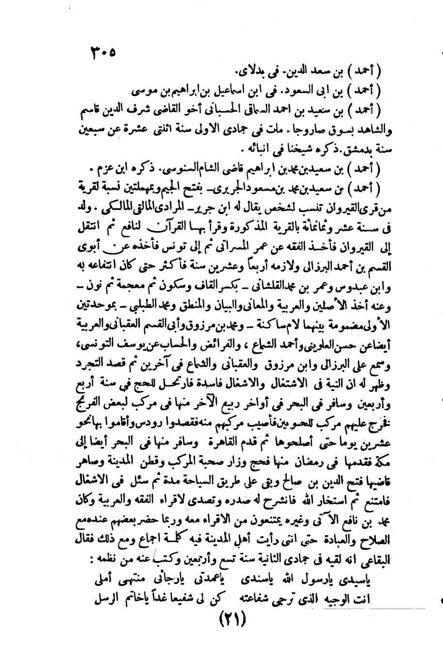 أَحْمد بن سعيد بن مُحَمَّد بن مَسْعُود الْجريرِي بِفَتْح الْجِيم وبمهملتين نِسْبَة لقرية من قرى القيروان تنْسب لشخص يُقَال لَهُ ابْن جرير الْمرَادِي المالقي الْمَالِكِي. / ولد فِي سنة عشر وَثَمَانمِائَة بالقرية الْمَذْكُورَة وَقَرَأَ بهَا الْقُرْآن لنافع ثمَّ انْتقل إِلَى القيروان فَأخذ الْفِقْه عَن عمر المسراتي ثمَّ إِلَى تونس فَأَخذه عَن أَبَوي الْقسم بن أَحْمد البرزالي ولازمه أَرْبعا وَعشْرين سنة فَأكْثر حَتَّى كَانَ انتفاعه بِهِ وَابْن عَبدُوس وَعمر بن مُحَمَّد القلشاني بِكَسْر الْقَاف وَسُكُون ثمَّ مُعْجمَة ثمَّ نون وَعنهُ أَخذ الْأَصْلَيْنِ والعربية والمعاني وَالْبَيَان والمنطق وَمُحَمّد الطبلبي بموحدتين الأولى مَضْمُومَة بَينهمَا لَام سَاكِنة مُحَمَّد بن مَرْزُوق وَأبي الْقسم العقباني والعربية أَيْضا عَن حسن العلويني وَأحمد الشماع، والفرائض والحساب عَن يُوسُف التّونسِيّ، وَسمع على البرزالي وَابْن مَرْزُوق والعقباني والشماع فِي آخَرين ثمَّ قصد التجرد وَظهر لَهُ أَن النِّيَّة فِي الِاشْتِغَال والأشغال فَاسِدَة فارتحل لِلْحَجِّ فِي سنة أَربع وَأَرْبَعين وسافر فِي الْبَحْر فِي أَوَاخِر ربيع الآخر مِنْهَا فِي مركب لبَعض الفرنج فَخرج عَلَيْهِم مركب للحسويين فأصيب مركبهم مِنْهُ فقصدوا رودس وَأَقَامُوا بهَا نَحْو عشْرين يَوْمًا حَتَّى أصلحوها ثمَّ قدم الْقَاهِرَة وسافر مِنْهَا فِي الْبَحْر أَيْضا إِلَى مَكَّة فَقَدمهَا فِي رَمَضَان مِنْهَا فحج وزار صُحْبَة الْمركب وقطن الْمَدِينَة وصاهر قاضيها فتح الدّين بن صَالح وَبَقِي على طَرِيق السياحة مُدَّة ثمَّ سُئِلَ فِي الأشغال فَامْتنعَ ثمَّ استخار الله فانشرح لَهُ صَدره وتصدى لإقراء الْفِقْه والعربية وَكَانَ مُحَمَّد بن نَافِع الْآتِي وَغَيره يمتنعون من الإقراء مَعَه وَرُبمَا حضر بَعضهم عِنْده مَعَ الصّلاح وَالْعِبَادَة حَتَّى أنني رَأَيْت أهل الْمَدِينَة فِيهِ كلمة إِجْمَاع وَمَعَ ذَلِك فَقَالَ البقاعي أَنه لقِيه فِي جُمَادَى الثَّانِيَة سنة تسع وَأَرْبَعين وَكتب عَنهُ من نظمه: