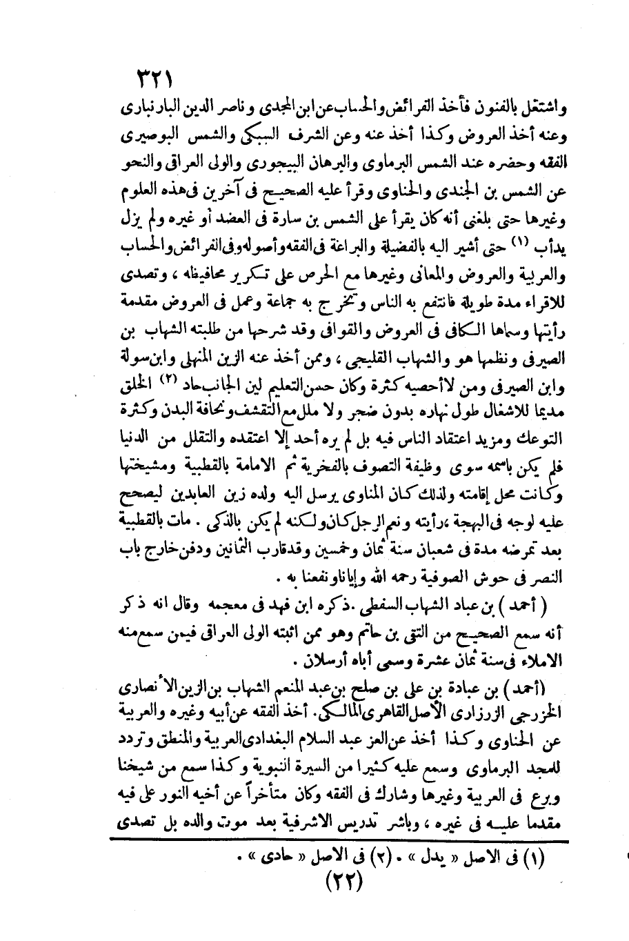 واشتغل بالفنون فَأخذ الْفَرَائِض والحساب عَن ابْن المجدي وناصر الدّين البارنباري وَعنهُ أَخذ الْعرُوض وَكَذَا أَخذ عَنهُ وَعَن الشّرف السُّبْكِيّ وَالشَّمْس البوصيري الْفِقْه وحضره عِنْد الشَّمْس الْبرمَاوِيّ والبرهان البيجوري وَالْوَلِيّ الْعِرَاقِيّ والنحو عَن الشَّمْس بن الجندي والحناوي وَقَرَأَ عَلَيْهِ الصَّحِيح فِي آخَرين فِي هَذِه الْعُلُوم وَغَيرهَا حَتَّى بَلغنِي أَنه كَانَ يقْرَأ على الشَّمْس بن سارة فِي الْعَضُد أَو غَيره وَلم يزل يدأب حَتَّى أُشير إِلَيْهِ بالفضيلة والبراعة فِي الْفِقْه وأصوله وَفِي الْفَرَائِض والحساب والعربية وَالْعرُوض والمعاني وَغَيرهَا مَعَ الْحِرْص على تَكْرِير محافيظه، وتصدى للإقراء مُدَّة طَوِيلَة فَانْتَفع بِهِ النَّاس وَتخرج بِهِ جمَاعَة وَعمل فِي الْعرُوض مُقَدّمَة رَأَيْتهَا وسماها الْكَافِي فِي الْعرُوض والقوافي وَقد شرحها من طلبته الشهَاب بن الصَّيْرَفِي ونظمها هُوَ الشهَاب القليجي،)