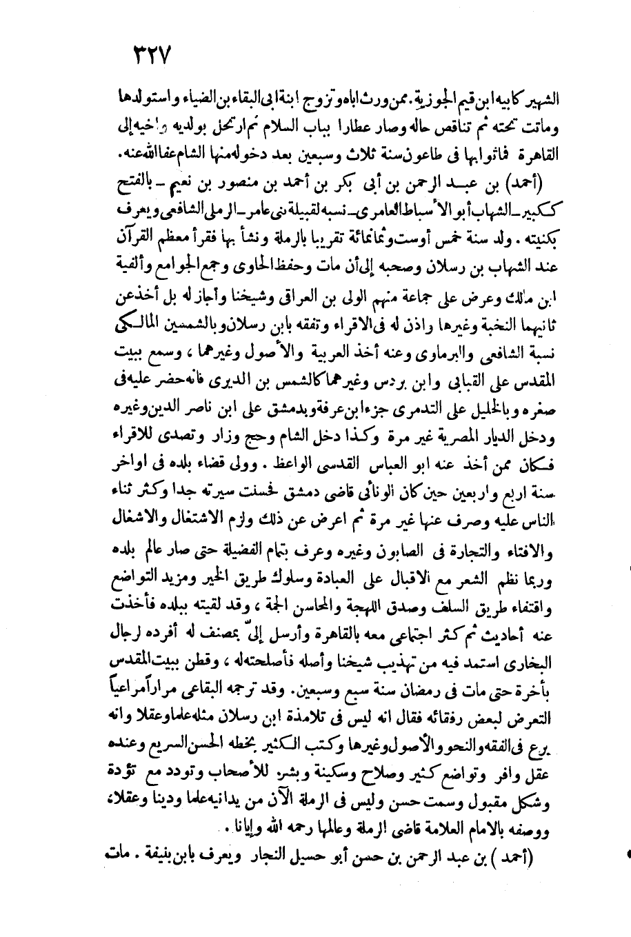 أَحْمد بن عبد الرَّحْمَن بن أبي بكر بن أَحْمد بن مَنْصُور بن نعيم بِالْفَتْح ككبير الشهَاب أَبُو الأسباط العامري نسبه لقبيلة بني عَامر الرَّمْلِيّ الشَّافِعِي وَيعرف بكنيته. / ولد سنة خمس أَو سِتّ وَثَمَانمِائَة تَقْرِيبًا بالرملة وَنَشَأ بهَا فَقَرَأَ مُعظم الْقُرْآن عِنْد الشهَاب بن رسْلَان وَصَحبه إِلَى أَن مَاتَ وَحفظ الْحَاوِي وَجمع الْجَوَامِع وألفية ابْن مَالك وَعرض على جمَاعَة مِنْهُم الْوَلِيّ بن الْعِرَاقِيّ وَشَيخنَا وَأَجَازَ لَهُ بل أَخذ عَن ثَانِيهمَا النخبة وَغَيرهَا وَأذن لَهُ فِي الإقراء وتفقه