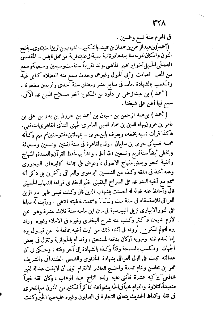 أَحْمد بن عبد الرَّحْمَن بن حمدَان بن حميد بِالتَّكْبِيرِ الشهَاب بن الزين العنبتاوي بِفَتْح النُّون وَإِسْكَان الْمُوَحدَة بعْدهَا فوقانية نِسْبَة إِلَى عنبتا قَرْيَة من عمل نابلس الْمَقْدِسِي الصَّالِحِي الْحَنْبَلِيّ أَخُو إِبْرَاهِيم الْمَاضِي. / ولد تَقْرِيبًا سنة سِتّ وَسبعين وَسَبْعمائة وَسمع من الْمُحب الصَّامِت وَأبي الهول وَغَيرهمَا وَحدث سمع مِنْهُ الْفُضَلَاء كَابْن فَهد وتكسب بِالشَّهَادَةِ. مَاتَ فِي سَابِع عشر رَمَضَان سنة إِحْدَى وَأَرْبَعين مطعونا.
