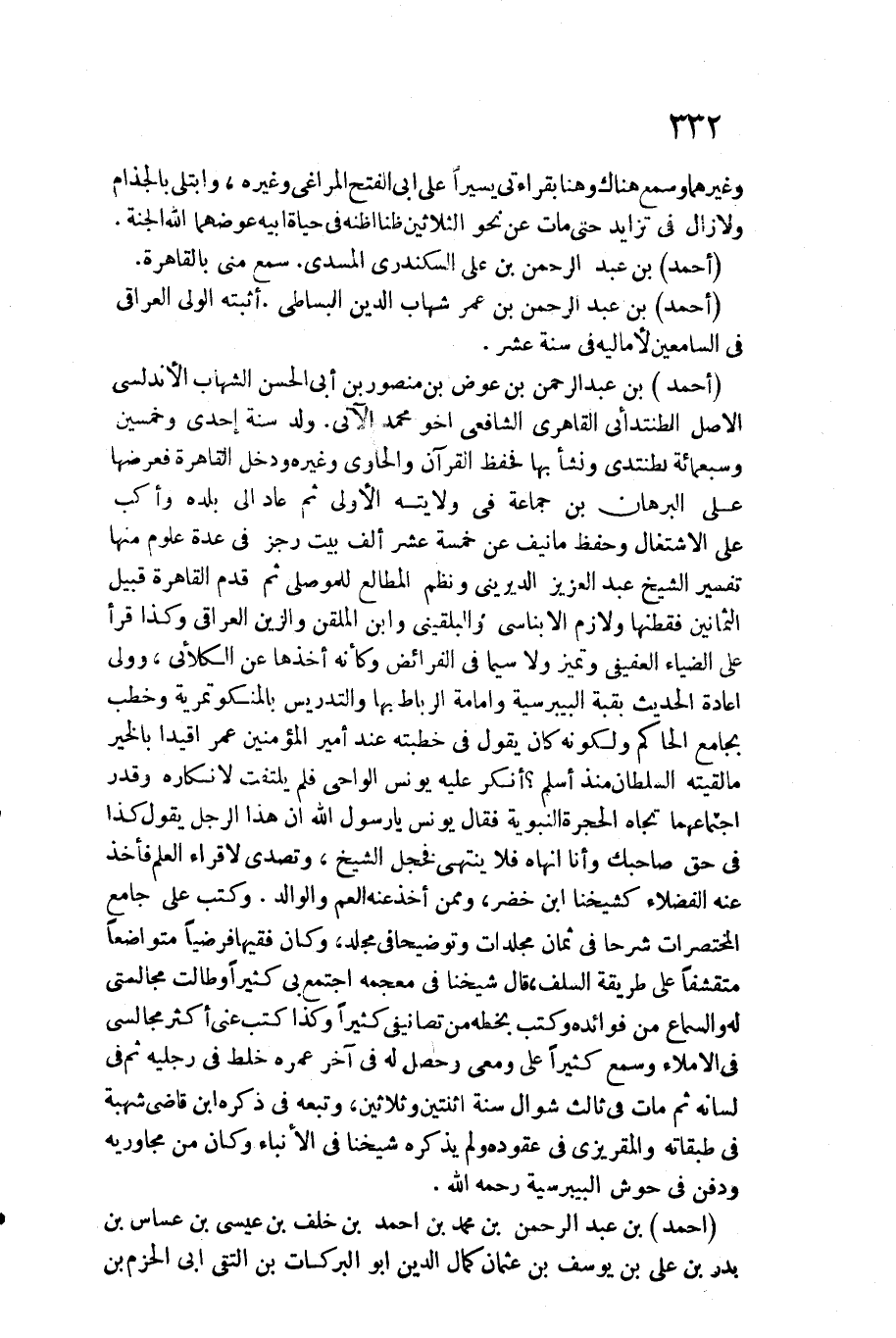 المختصرات شرحا فِي ثَمَان مجلدات وتوضيحا فِي مُجَلد، وَكَانَ فَقِيها فرضيا متواضعا متقشفا على طَريقَة السّلف، قَالَ شَيخنَا فِي مُعْجَمه اجْتمع بِي كثيرا وطالت مجالستي لَهُ وَالسَّمَاع من فَوَائده وَكتب بِخَطِّهِ من تصانيفي كثيرا وَكَذَا كتب عني أَكثر مجالسي فِي الْإِمْلَاء وَسمع كثيرا عَليّ وَمَعِي وَحصل هَل فِي آخر عمره خلط فِي رجلَيْهِ ثمَّ فِي لِسَانه ثمَّ مَاتَ فِي ثَالِث شَوَّال سنة اثْنَتَيْنِ وَثَلَاثِينَ، وَتَبعهُ فِي ذكره ابْن قَاضِي شُهْبَة فِي طبقاته والمقريزي فِي عقوده وَلم يذكرهُ شَيخنَا فِي الأنباء وَكَانَ من مجاوريه وَدفن فِي حوش البيبرسية رَحمَه الله.