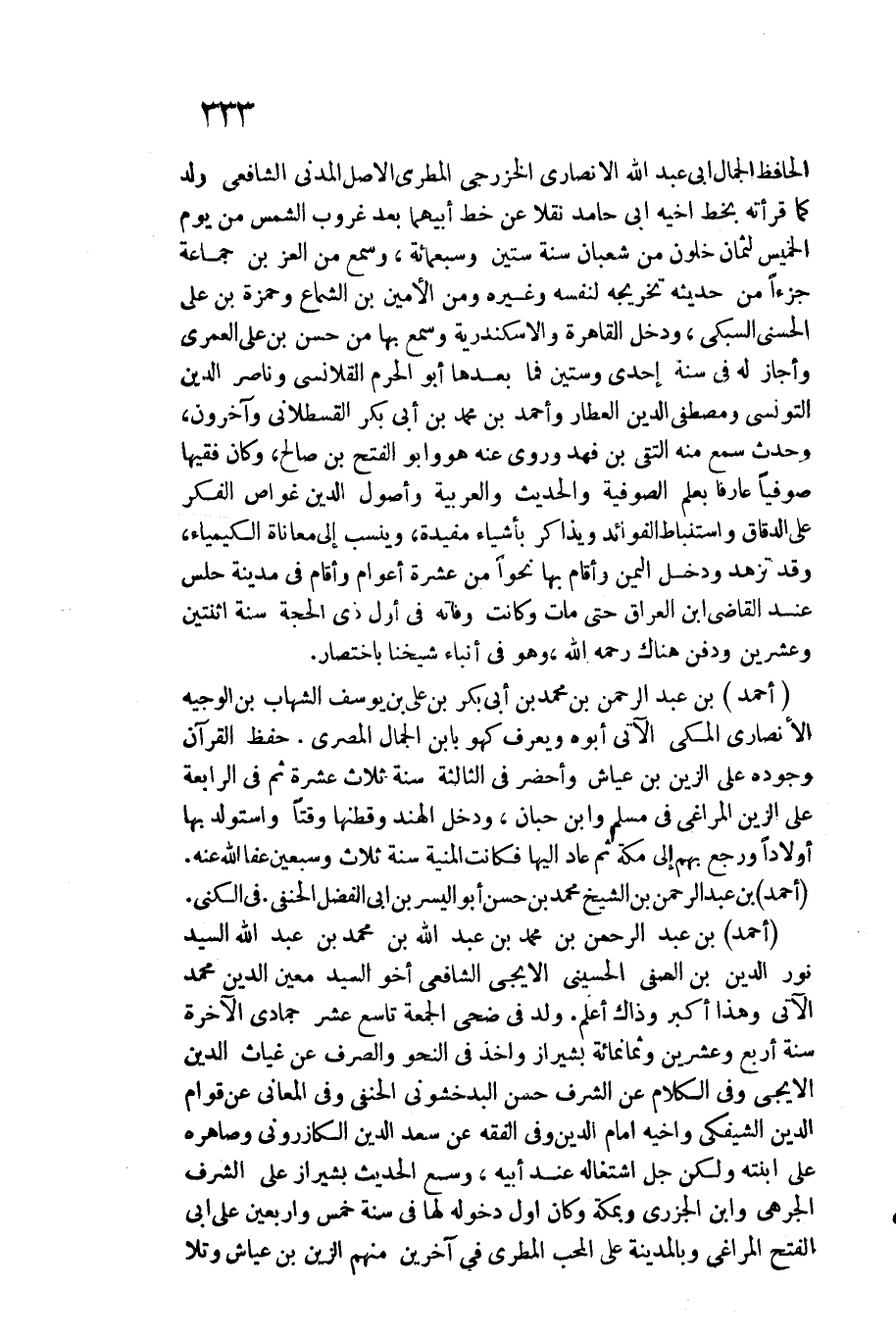 الْحَافِظ الْجمال أبي عبد الله الْأنْصَارِيّ الخزرجي المطري الأَصْل الْمدنِي الشَّافِعِي / ولد كَمَا قرأته بِخَط أَخِيه أبي حَامِد نقلا عَن خطّ أَبِيهِمَا بعد غرُوب الشَّمْس من يَوْم الْخَمِيس لثمان خلون من شعْبَان سنة سِتِّينَ وَسَبْعمائة، وَسمع من الْعِزّ بن جمَاعَة جُزْءا من حَدِيثه تَخْرِيجه لنَفسِهِ وَغَيره وَمن الْأمين بن الشماع وَحَمْزَة بن عَليّ الحسني السُّبْكِيّ، وَدخل الْقَاهِرَة والاسكندرية وَسمع بهَا من حسن بن عَليّ الْعمريّ وَأَجَازَ لَهُ فِي سنة إِحْدَى وَسِتِّينَ فَمَا بعْدهَا أَبُو الْحرم القلانسي وناصر الدّين التّونسِيّ ومصطفى الدّين الْعَطَّار وَأحمد بن مُحَمَّد بن أبي بكر الْقُسْطَلَانِيّ وَآخَرُونَ، وَحدث سمع مِنْهُ التقي بن فَهد وروى عَنهُ هُوَ وَأَبُو الْفَتْح بن صَالح، وَكَانَ فَقِيها صوفيا عَارِفًا بِعلم الصُّوفِيَّة والْحَدِيث والعربية وأصول الدّين غواص الْفِكر على الدقاق واستنباط الْفَوَائِد ويذاكر بأَشْيَاء مفيدة، وينسب إِلَى معاناة الكيمياء، وَقد تزهد وَدخل الْيمن وَأقَام بهَا نَحوا من عشرَة أَعْوَام وَأقَام فِي مَدِينَة حلْس عِنْد القَاضِي ابْن الْعرَاق حَتَّى مَاتَ وَكَانَت وَفَاته فِي أول ذِي الْحجَّة سنة اثْنَتَيْنِ وَعشْرين وَدفن هُنَاكَ رَحمَه الله، وَهُوَ فِي أنباء شَيخنَا بِاخْتِصَار.