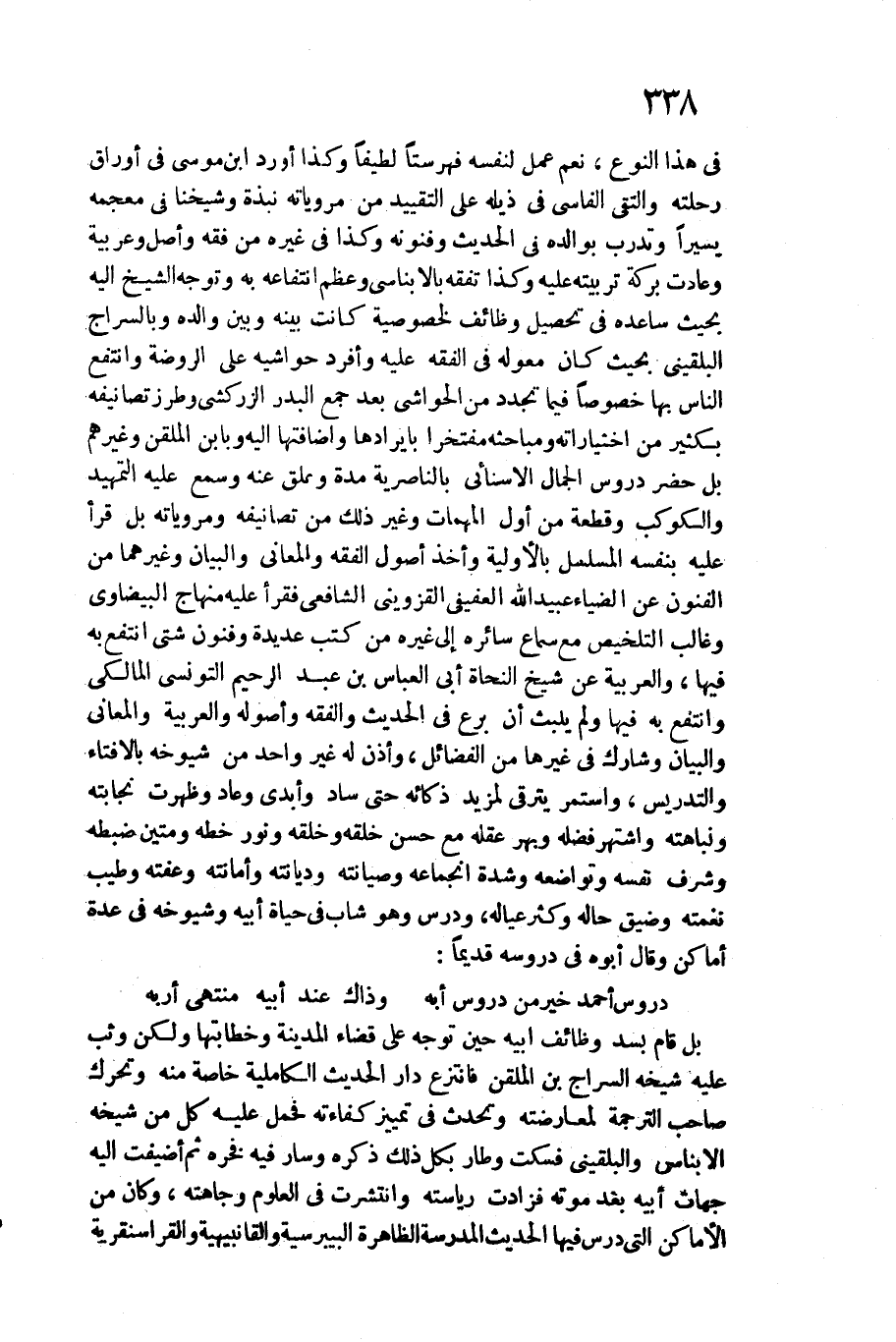 فِي هَذَا النَّوْع، نعم عمل لنَفسِهِ فهرستا لطيفا وَكَذَا أورد ابْن مُوسَى فِي أوراق رحلته والتقي الفاسي فِي ذيله على التَّقْيِيد من مروياته نبذة وَشَيخنَا فِي مُعْجَمه يَسِيرا وتدرب بوالده فِي الحَدِيث وفنونه وَكَذَا فِي غَيره من فقه وأصل وعربية وعادت بركَة تَرْبِيَته عَلَيْهِ وَكَذَا تفقه بالأبناسي وَعظم انتفاعه بِهِ وَتوجه الشَّيْخ إِلَيْهِ بِحَيْثُ ساعده فِي تَحْصِيل وظائف لخصوصية كَانَت بَينه وَبَين وَالِده وبالسراج البُلْقِينِيّ بِحَيْثُ كَانَ معوله فِي الْفِقْه عَلَيْهِ وأفرد حَوَاشِيه على الرَّوْضَة وانتفع النَّاس بهَا خُصُوصا فِيمَا تجدّد من الْحَوَاشِي بعد جمع الْبَدْر الزَّرْكَشِيّ وطرز تصانيفه بِكَثِير من اختياراته ومباحثه مفتخرا بإيرادها وإضافتها إِلَيْهِ وبابن الملقن وَغَيرهم بل حضر دروس الْجمال الأسنائي بالناصرية مُدَّة وعلق عَنهُ وَسمع عَلَيْهِ التَّمْهِيد والكوكب وَقطعَة من أول الْمُهِمَّات وَغير ذَلِك من تصانيفه ومروياته بل قَرَأَ عَلَيْهِ بِنَفسِهِ المسلسل بالأولية وَأخذ أصُول الْفِقْه والمعاني وَالْبَيَان وَغَيرهمَا من الْفُنُون عَن الضياء عبيد الله العفيفي الْقزْوِينِي الشَّافِعِي فَقَرَأَ عَلَيْهِ منهاج الْبَيْضَاوِيّ وغالب التَّلْخِيص مَعَ سَماع سائره إِلَى غَيره من كتب عديدة وفنون شَتَّى انْتفع بِهِ فِيهَا، والعربية عَن شيخ النُّحَاة أبي الْعَبَّاس بن عبد الرَّحِيم التّونسِيّ الْمَالِكِي وانتفع بِهِ فِيهَا وَلم يلبث أَن برع فِي الحَدِيث وَالْفِقْه وأصوله والعربية والمعاني وَالْبَيَان وشارك فِي غَيرهَا من الْفَضَائِل، وَأذن لَهُ غير وَاحِد من شُيُوخه بالإفتاء والتدريس، وَاسْتمرّ يترقى لمزيد ذكائه حَتَّى سَاد وَأبْدى وَعَاد وَظَهَرت نجابته ونباهته واشتهر فَضله وبهر عقله مَعَ حسن خلقه وخلقه وَنور خطه ومتين ضَبطه وَشرف نَفسه وتواضعه وَشدَّة انجماعه وصيانته وديانته وأمانته وعفته وَطيب نغمته وضيق حَاله وَكثر عِيَاله، ودرس وَهُوَ شَاب فِي حَيَاة أَبِيه وشيوخه فِي عدَّة أَمَاكِن وَقَالَ أَبوهُ فِي دروسه قَدِيما: