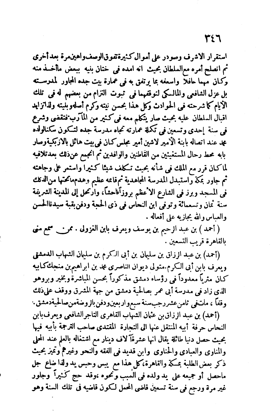 اسْتِقْرَار الْأَشْرَف وصودر على أَمْوَال كَثِيرَة تفوق الْوَصْف وأهين مرّة بعد أُخْرَى ثمَّ انصلح أمره مَعَ السُّلْطَان بِحَيْثُ أَنه أمده فِي ختان بنيه بِبَعْض مَا أَخذ مِنْهُ وَكَانَ مهما حافلا وأسعفه بِمَا يرتفق بِهِ فِي عمَارَة بَيت جده المجاور لمدرسته بل عزل الشَّافِعِي والمالكي لتوقفهما فِي ثُبُوت الْتِزَام من بَعضهم لَهُ فِي تِلْكَ الْأَيَّام كَمَا شرحته فِي الْحَوَادِث وكل هَذَا بِحسن نِيَّته وكرم أَصله وبنيته وَلذَا تزايد إقبال السُّلْطَان عَلَيْهِ بِحَيْثُ صَار يتَكَلَّم مَعَه فِي كثير من المآرب فتقضي وَشرع فِي سنة إِحْدَى وَتِسْعين فِي تَكْمِلَة عِمَارَته تجاه مدرسة جده لتَكون سكنا لوَلَده مُحَمَّد عِنْد اتِّصَاله بابنة الْأَمِير لاشين أَمِير مجْلِس كَانَ فِي بَيت هائل بالأزبكية وَصَارَ بَابه محط رحال المستغيثين من القاطنين والوافدين ثمَّ انجمع عَن ذَلِك بعد تلافيه لما كَانَ قرر مَعَ الْملك فِي شَأْنه بِحَيْثُ تكلّف شَيْئا كثيرا وَاسْتمرّ على وجاهته ثمَّ جاور بِمَكَّة واستبدل الْمدرسَة المجاهدية ثمَّ قائمه عَظِيم وَهدم مَا تحتهَا من الدكك فِي الْمَسْجِد وبرز فِي الشَّارِع الْأَعْظَم بروزا فَاحِشا، وارتحل إِلَى الْمَدِينَة الشَّرِيفَة سنة ثَمَان وَتِسْعمِائَة وَتُوفِّي ابْن النّحاس فِي ذِي الْحجَّة وَدفن بقبة سيدنَا الْحسن وَالْعَبَّاس وَالله يجازيه على أَفعاله.