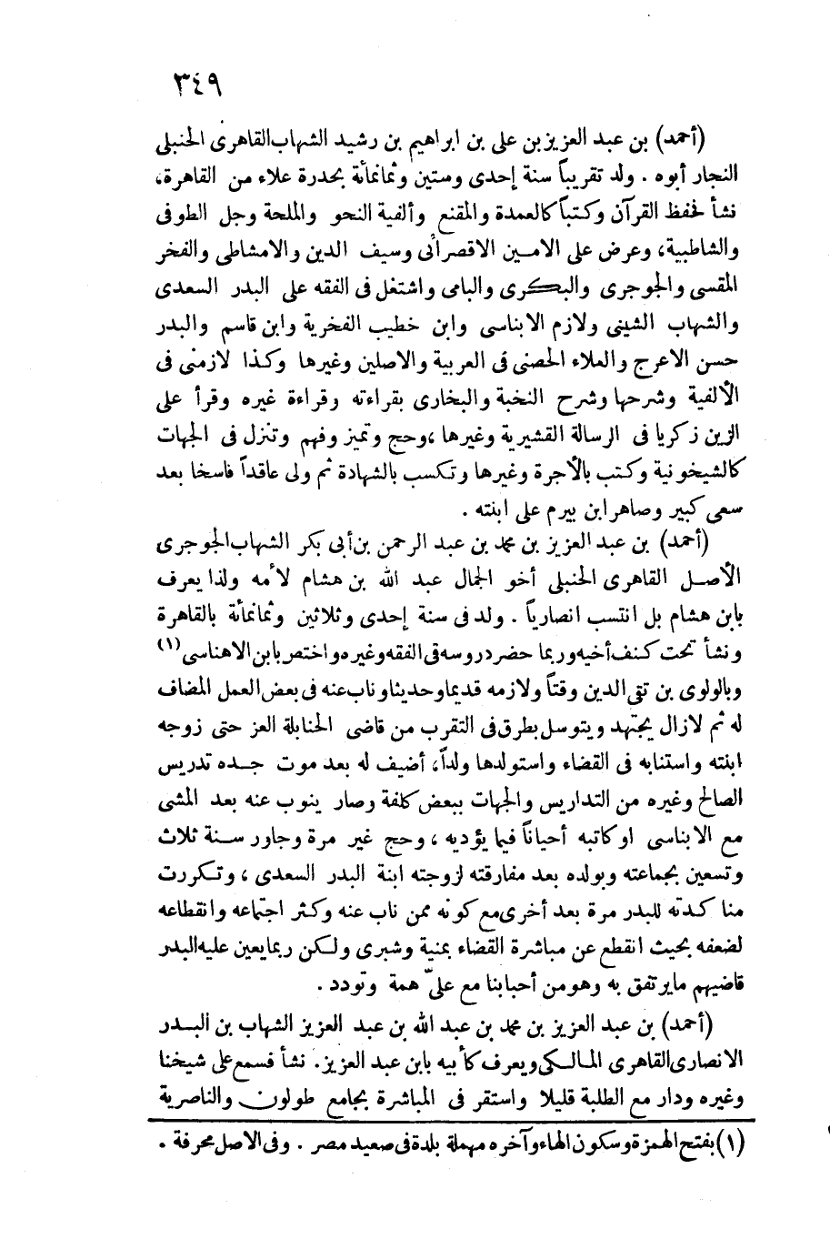 أَحْمد بن عبد الْعَزِيز بن عَليّ بن إِبْرَاهِيم بن رشيد الشهَاب القاهري الْحَنْبَلِيّ النجار أَبوهُ. / ولد تَقْرِيبًا سنة إِحْدَى وَسِتِّينَ وَثَمَانمِائَة بحدرة عَلَاء من الْقَاهِرَة، نَشأ فحفظ الْقُرْآن وكتبا كالعمدة وَالْمقنع وألفية النَّحْو والملحة وَجل الطوفي والشاطبية، وَعرض على الْأمين الأقصرائي وَسيف الدّين والأمشاطي وَالْفَخْر المقسي والجوجري والبكري والبامي واشتغل فِي الْفِقْه على الْبَدْر السَّعْدِيّ والشهاب الشيني ولازم الأبناسي وَابْن خطيب الفخرية وَابْن قَاسم والبدر حسن الْأَعْرَج والْعَلَاء الحصني فِي الْعَرَبيَّة والأصلين وَغَيرهَا وَكَذَا لازمني فِي الألفية وَشَرحهَا وَشرح النخبة وَالْبُخَارِيّ بقرَاءَته وَقِرَاءَة غَيره وَقَرَأَ على الزين زَكَرِيَّا فِي الرسَالَة القشيرية وَغَيرهَا، وَحج وتميز وَفهم وتنزل فِي الْجِهَات كالشيخونية وَكتب بالأخرة وَغَيرهَا وتكسب بِالشَّهَادَةِ ثمَّ ولي عاقدا فاسخا بعد سعي كَبِير وصاهر ابْن بيرم على ابْنَته.