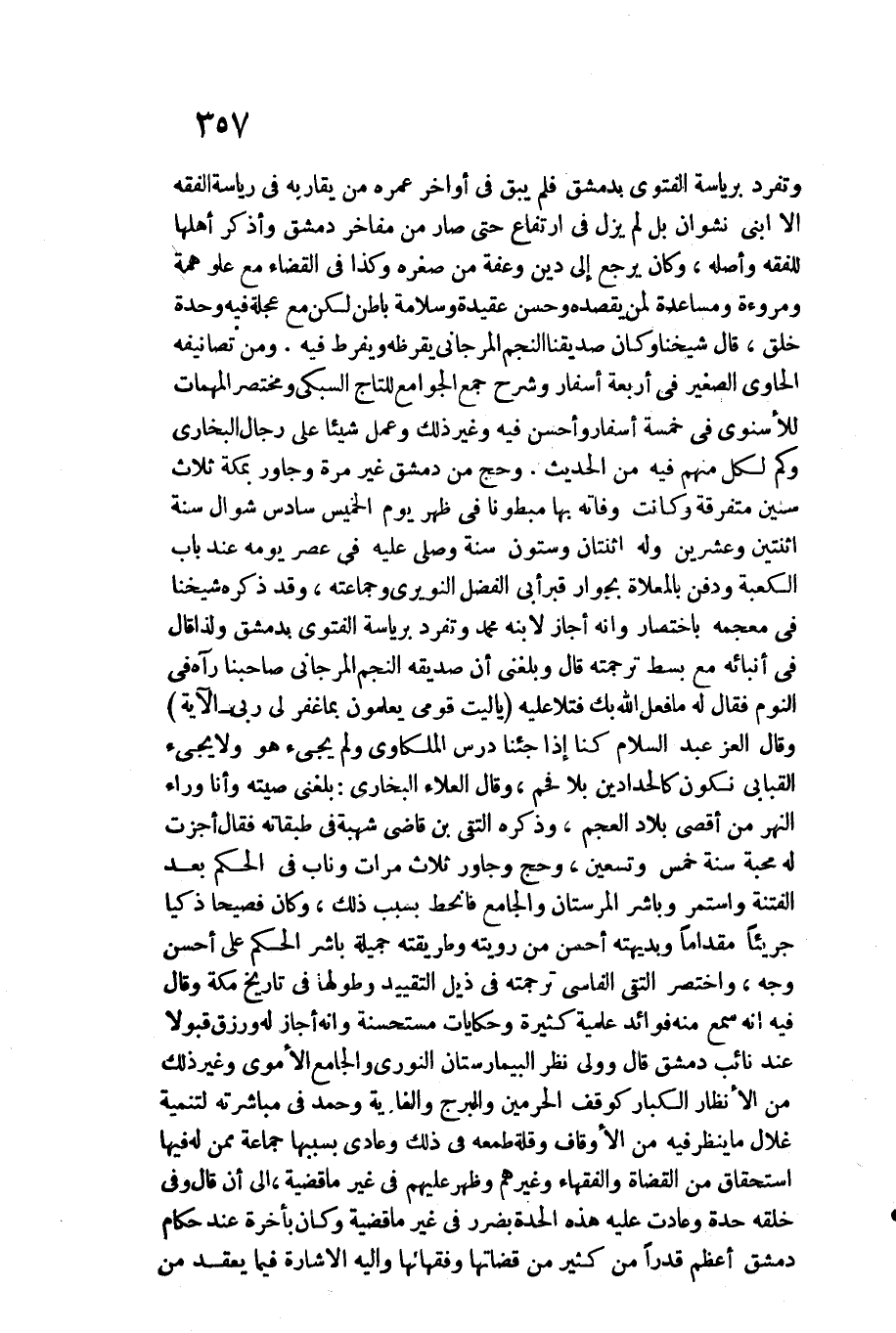 وَتفرد برياسة الْفَتْوَى بِدِمَشْق فَلم يبْق فِي أَوَاخِر عمره من يُقَارِبه فِي رياسة الْفِقْه إِلَّا ابْني نشوان بل لم يزل فِي ارْتِفَاع حَتَّى صَار من مفاخر دمشق وأذكر أَهلهَا للفقه وَأَصله، وَكَانَ يرجع إِلَى دين وعفة من صغره وَكَذَا فِي الْقَضَاء مَعَ علو همة ومروءة ومساعدة لمن يَقْصِدهُ وَحسن عقيدة وسلامة بَاطِن لَكِن مَعَ عجلة فِيهِ وحدة خلق، قَالَ شَيخنَا وَكَانَ صديقنا النَّجْم الْمرْجَانِي يقرظه ويفرط فِيهِ. وَمن تصانيفه الْحَاوِي الصَّغِير فِي أَرْبَعَة)