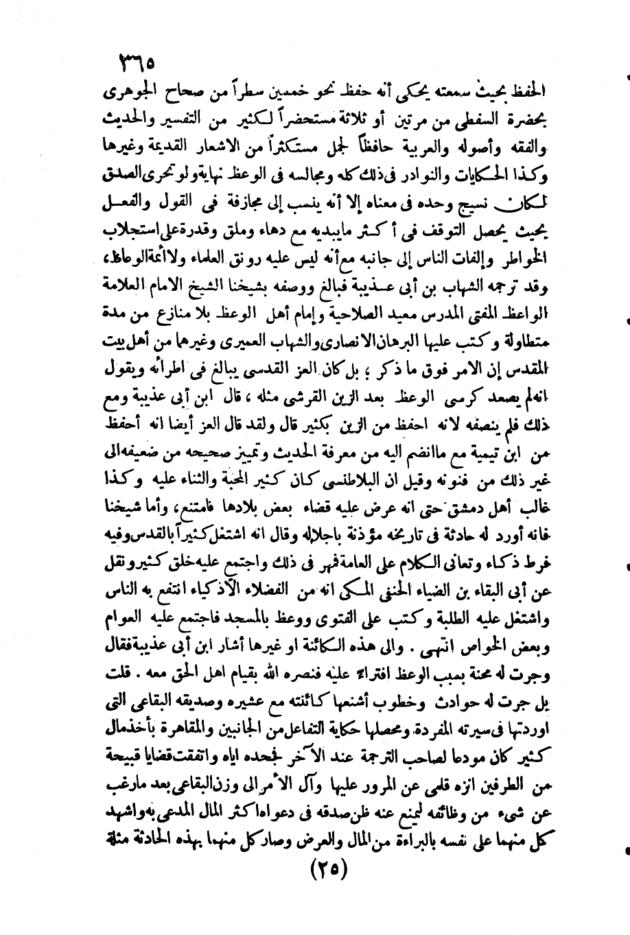 الْحِفْظ بِحَيْثُ سمعته يَحْكِي أَنه حفظ نَحْو خمسين سطرا من صِحَاح الْجَوْهَرِي بِحَضْرَة السفطي من مرَّتَيْنِ أَو ثَلَاثَة مستحضرا لكثير من التَّفْسِير والْحَدِيث وَالْفِقْه وأصوله والعربية حَافِظًا لجمل مستكثرا من الْأَشْعَار الْقَدِيمَة وَغَيرهَا وَكَذَا الحكايات والنوادر فِي ذَلِك كُله ومجالسه فِي الْوَعْظ نِهَايَة وَلَو تحرى الصدْق لَكَانَ نَسِيج وَحده فِي مَعْنَاهُ إِلَّا أَنه ينْسب إِلَى مجازفة فِي القَوْل وَالْفِعْل بِحَيْثُ)