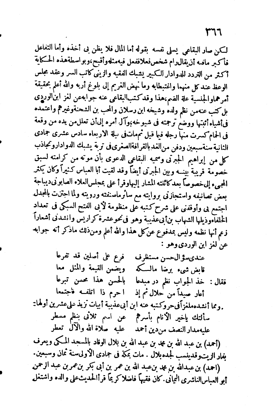 وَاعْتَمدهُ فِي أَشْيَاء أثبتها وَوضع تَرْجَمته فِي شُيُوخه وَآل أمره إِلَى أَن تعلل من يَده من وقْعَة فِي الْحمام كسرت مِنْهَا رجله فِيمَا قيل ثمَّ مَاتَ فِي لَيْلَة الْأَرْبَعَاء سادس عشري جُمَادَى الثَّانِيَة سنة سبعين وَدفن من الْغَد بالقرافة الصُّغْرَى فِي تربة يشبك الدوادار وتجاذب كل من إِبْرَاهِيم الجبرتي وسميه البقاعي الدعوي بِأَن مَوته من كرامته لسبق خُصُومَة قريبَة بَينه وَبَين الجبرتي أَيْضا وَقد لقِيت أَبَا الْعَبَّاس كثيرا وَكَانَ يكثر الْمَجِيء إِلَيّ خُصُوصا بعد كائنته الْمشَار إِلَيْهِ وَقَرَأَ عَليّ بِمَجْلِس الْعَلَاء الصَّابُونِي ديباجة بعض تصانيفه واستجازني بروايته مَعَ سَائِر مَا صنفته ورويته وَلما اجتزت بالمجدل اجْتمع بِي وأوقفني على شرح كتبه على منظومة لأبي الْفَتْح السُّبْكِيّ فِي تعداد الْخُلَفَاء وذيلها الشهَاب بن أبي عذيبة وَهُوَ فِي نَحْو عشرَة كراريس وأنشدني أشعارا زعم أَنَّهَا نظمه وَلَيْسَ بمدفوع عَن كل هَذَا وَالله أعلم وَمن ذَلِك مَا ذكر أَنه جَوَابه عَن لغز ابْن الوردي وَهُوَ: