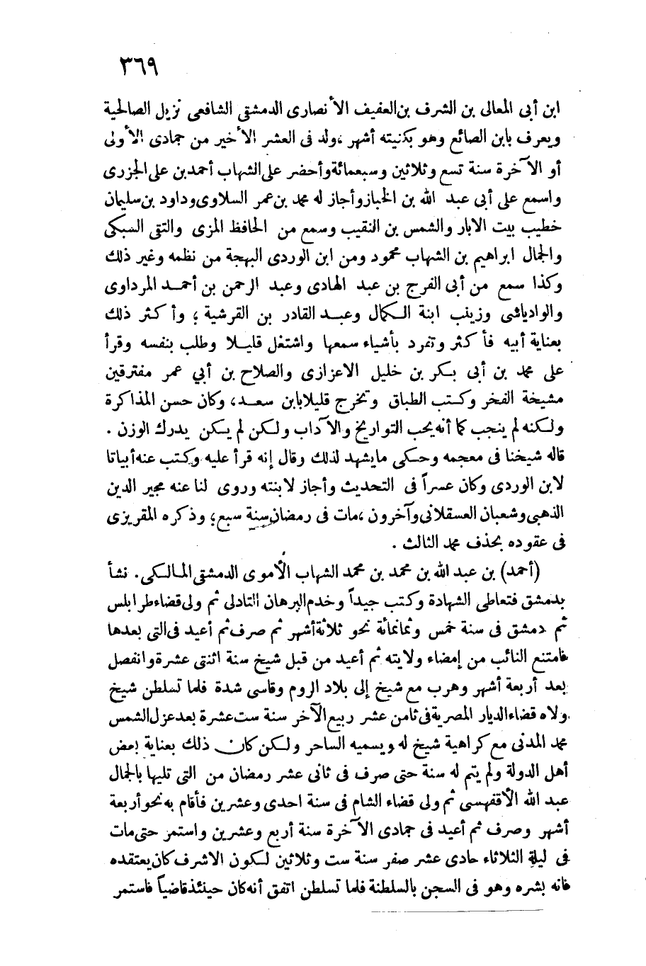 أَحْمد بن عبد الله بن مُحَمَّد بن مُحَمَّد الشهَاب الْأمَوِي الدِّمَشْقِي الْمَالِكِي. / نَشأ بِدِمَشْق فتعاطى الشَّهَادَة وَكتب جيدا وخدم الْبُرْهَان التادلي ثمَّ ولي قَضَاء طرابلس ثمَّ دمشق فِي سنة خمس وَثَمَانمِائَة نَحْو ثَلَاثَة أشهر ثمَّ صرف ثمَّ أُعِيد فِي الَّتِي بعْدهَا فَامْتنعَ النَّائِب من إِمْضَاء ولَايَته ثمَّ أُعِيد من قبل شيخ سنة اثْنَتَيْ عشرَة وانفصل بعد أَرْبَعَة أشهر وهرب مَعَ شيخ إِلَى بِلَاد الرّوم وقاسى شدَّة فَلَمَّا تسلطن شيخ ولاه قَضَاء الديار المصرية فِي ثامن عشر ربيع الآخر سنة سِتّ عشرَة بعد عزل الشَّمْس مُحَمَّد الْمدنِي مَعَ كَرَاهِيَة شيخ لَهُ ويسميه السَّاحر وَلَكِن كَانَ ذَلِك بعناية بعض أهل الدولة وَلم يتم لَهُ سنة حَتَّى صرف فِي ثَانِي عشر رَمَضَان من الَّتِي تَلِيهَا بالجمال عبد الله الأقفهسي ثمَّ ولي قَضَاء الشَّام فِي سنة إِحْدَى وَعشْرين فَأَقَامَ بِهِ نَحْو أَرْبَعَة أشهر وَصرف ثمَّ أُعِيد فِي جُمَادَى الْآخِرَة سنة أَربع وَعشْرين وَاسْتمرّ حَتَّى مَاتَ فِي لَيْلَة الثُّلَاثَاء حادي عشر صفر سنة سِتّ وَثَلَاثِينَ لكَون الْأَشْرَف كَانَ يَعْتَقِدهُ فَإِنَّهُ بشره وَهُوَ فِي السجْن بالسلطنة فَلَمَّا تسلطن اتّفق أَنه كَانَ حِينَئِذٍ قَاضِيا فاستمر