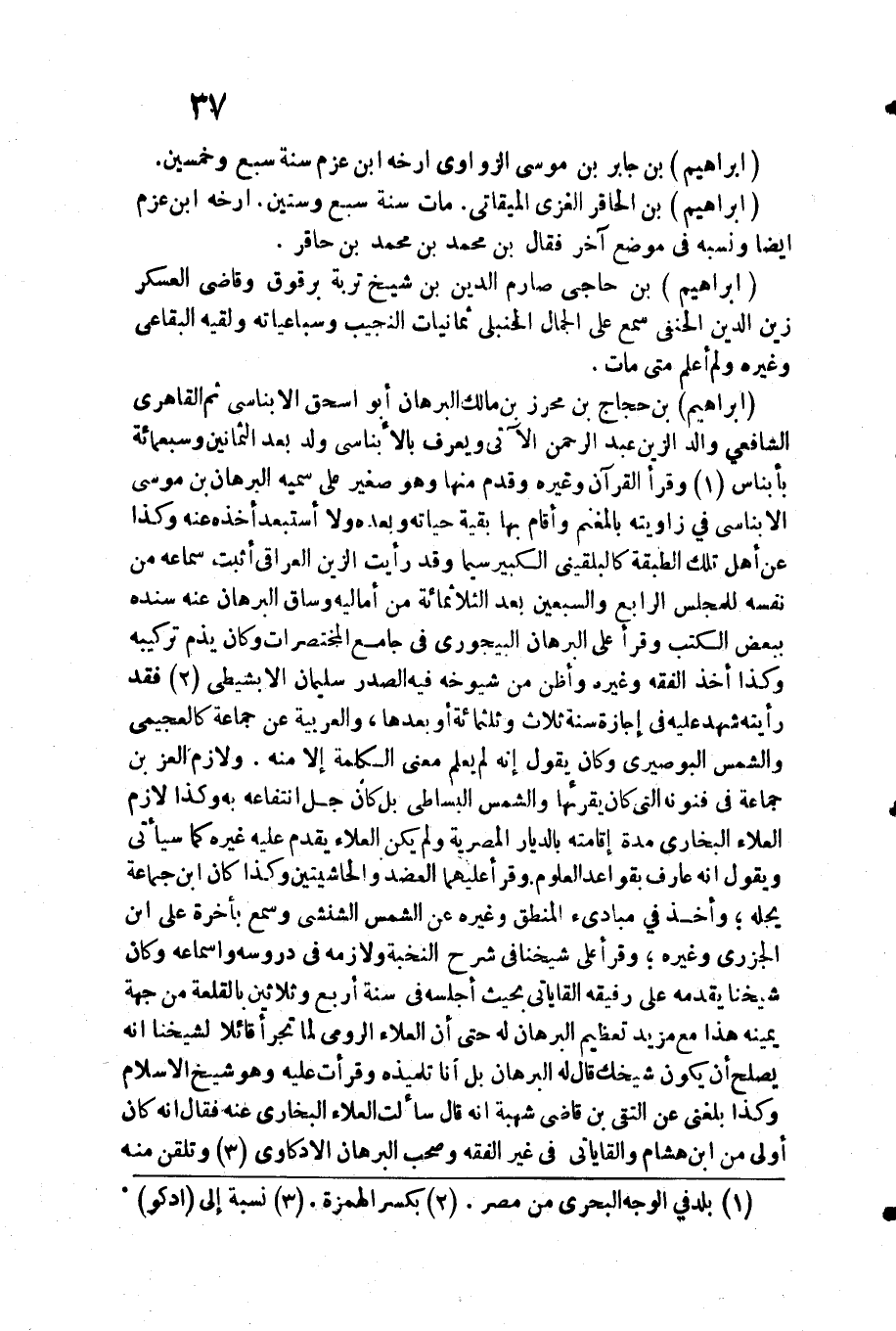 رَأَيْته شهد عَلَيْهِ فِي إجَازَة سنة ثَلَاث وثلثمائة أَو بعْدهَا والعربية عَن جمَاعَة كالعجيمي وَالشَّمْس البوصيري وَكَانَ يَقُول إِنَّه لم يعلم معنى الْكَلِمَة إِلَّا مِنْهُ. ولازم الْعِزّ بن جمَاعَة فِي فنونه الَّتِي كَانَ يقرئها وَالشَّمْس الْبِسَاطِيّ بل كَانَ جلّ انتفاعه بِهِ وَكَذَا لَازم الْعَلَاء البُخَارِيّ مُدَّة إِقَامَته بالديار المصرية وَلم يكن الْعَلَاء يقدم عَلَيْهِ غَيره كَمَا سَيَأْتِي وَيَقُول أَنه عَارِف بقواعد الْعُلُوم. وَقَرَأَ عَلَيْهِمَا الْعَضُد والحاشيتين وَكَذَا كَانَ ابْن جمَاعَة يجله وَأخذ فِي مبادىء الْمنطق وَغَيره عَن الشَّمْس الشنشي وَسمع بِأخرَة على ابْن الْجَزرِي وَغَيره وَقَرَأَ على شَيخنَا فِي شرح النخبة ولازمه فِي دروسه واسماعه وَكَانَ شَيخنَا يقدمهُ على رَفِيقه القاياتي بِحَيْثُ أجلسه فِي سنة أَربع وَثَلَاثِينَ بالقلعة من جِهَة يَمِينه هَذَا مَعَ مزِيد تَعْظِيم الْبُرْهَان لَهُ حَتَّى أَن الْعَلَاء الرُّومِي لما تجرأ قَائِلا لشَيْخِنَا انه يصلح أَن يكون شيخك قَالَ لَهُ الْبُرْهَان بل أَنا تِلْمِيذه وقرأت عَلَيْهِ وَهُوَ شيخ الاسلام وَكَذَا بَلغنِي عَن التقي بن قَاضِي شُهْبَة أَنه قَالَ سَأَلت الْعَلَاء البُخَارِيّ عَنهُ فَقَالَ انه كَانَ أولى من ابْن هِشَام والقاياتي فِي غير الْفِقْه وَصَحب الْبُرْهَان الادكاوي وتلقن مِنْهُ