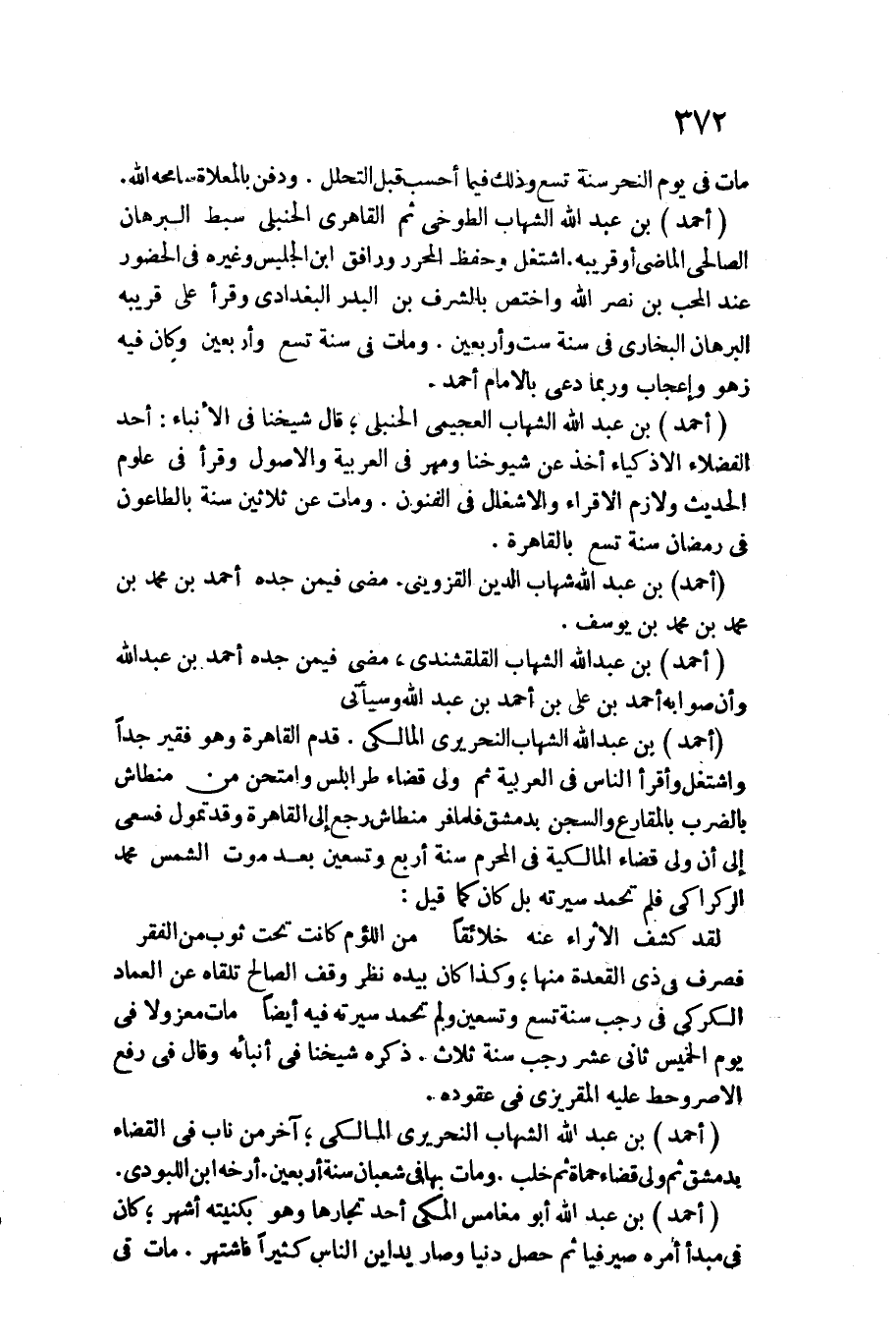 أَحْمد بن عبد الله الشهَاب النحريري الْمَالِكِي. / قدم الْقَاهِرَة وَهُوَ فَقير جدا واشتغل وأقرأ النَّاس فِي الْعَرَبيَّة ثمَّ ولي قَضَاء طرابلس وامتحن من منطاش بِالضَّرْبِ بالمقارع والسجن بِدِمَشْق فَلَمَّا فر منطاش رَجَعَ إِلَى الْقَاهِرَة وَقد تمول فسعى إِلَى أَن ولي قَضَاء الْمَالِكِيَّة فِي الْمحرم سنة أَربع وَتِسْعين بعد موت الشَّمْس مُحَمَّد الركراكي فَلم تحمد سيرته بل كَانَ كَمَا قيل: