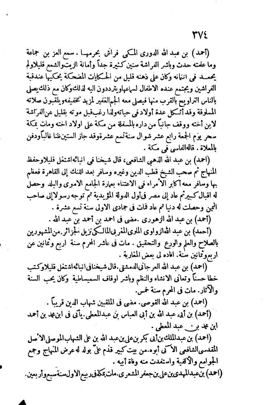 أَحْمد بن عبد الله الدوري الْمَكِّيّ فرَاش بحرمها. / سمع الْعِزّ بن جمَاعَة وَمَا عَلمته حدث وباشر الفراشة سِنِين كَثِيرَة جدا وَأَمَانَة الزَّيْت والشمع قَلِيلا وَلم يحمد فِي انتمائه وَكَانَ على ذهنه قَلِيل من الحكايات المضحكة يحكيها عِنْد قبَّة الفراشين ويجتمع عِنْده الْأَطْفَال لسماعها ويترددون إِلَيْهِ لذَلِك وَكَانَ مَعَ ذَلِك يُصَلِّي بِالنَّاسِ التَّرَاوِيح بِالْقربِ مِنْهَا فَيصَلي مَعَه الجم الْغَفِير لمزيد تخفيفه ويلقبون صلَاته المسلوقة وَقد أثكل عدَّة أَوْلَاد فِي حَيَاته وَلذَا رغب قبل مَوته بِقَلِيل عَن الفراشة لِابْنِ أُخْته ووقف جانبا من دَاره بالمسفلة من مَكَّة على أَوْلَاد أُخْته وَمَات بِمَكَّة سحر