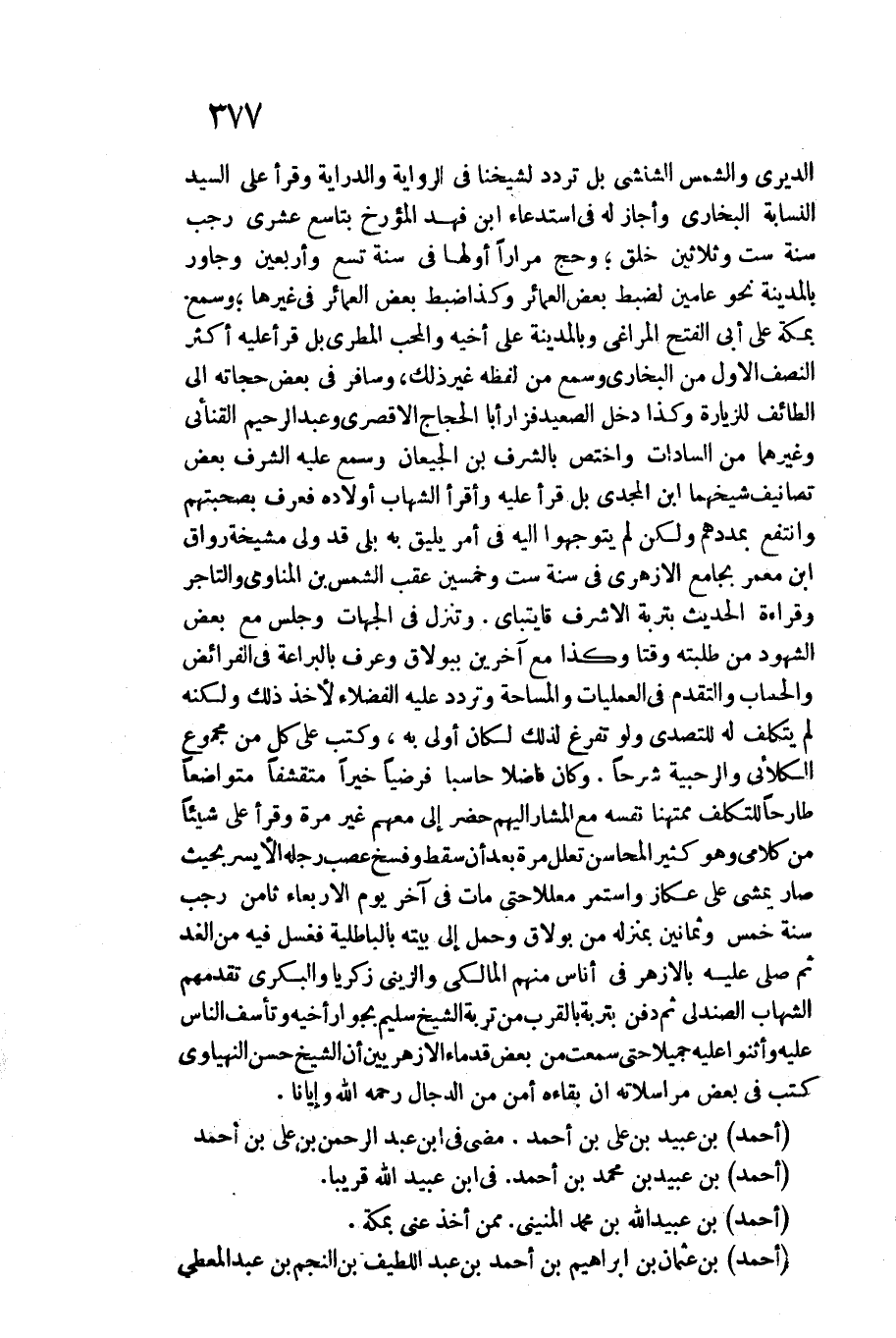 الديري وَالشَّمْس الشنشي بل تردد لشَيْخِنَا فِي الرِّوَايَة والدراية وَقَرَأَ على السَّيِّد النسابة البُخَارِيّ وَأَجَازَ لَهُ فِي استدعاء ابْن فَهد المؤرخ بتاسع عشري رَجَب سنة سِتّ وَثَلَاثِينَ خلق وَحج مرَارًا أَولهَا فِي سنة تسع وَأَرْبَعين وجاور بِالْمَدِينَةِ نَحْو عَاميْنِ لضبط بعض العمائر وَكَذَا ضبط بعض العمائر فِي)