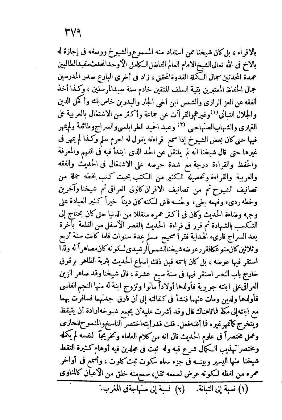 خَاص بك وأكمل الدّين والجلال التباني وَغَيرهم والقراءات عَن جمَاعَة وَأكْثر من الِاشْتِغَال بِالْعَرَبِيَّةِ على الغماري والشهاب الصنهاجي وَعبد الحميد الطرابلسي والسراج وَطَائِفَة وَلم يمهر فِيهَا حَتَّى كَانَ بعض الشُّيُوخ إِذا سمع قِرَاءَته يَقُول لَهُ احرم سلم وَكَذَا لم يمهر فِي غَيرهَا حَتَّى قَالَ شَيخنَا أَنه لم ينْتَقل عَن الْحَد الَّذِي ابْتَدَأَ فِيهِ فِي الْفَهم والمعرفة وَالْحِفْظ وَالْقِرَاءَة دَرَجَة مَعَ شدَّة حرصه على الِاشْتِغَال فِي الحَدِيث وَالْفِقْه والعربية وَالْقِرَاءَة وتحصيله الْكثير من الْكتب بِحَيْثُ كتب بِخَطِّهِ جملَة من تصانيف الشُّيُوخ ثمَّ من تصانيف الأقان كالولي الْعِرَاقِيّ ثمَّ شَيخنَا وَآخَرين وخطه رَدِيء وفهمه بطيء ولحنه فَاش لكنه كَانَ دينا خيرا كثير الْعِبَادَة على وَجهه وضاءة الحَدِيث وَكَانَ فِي أَكثر عمره متقللا من الدُّنْيَا حَتَّى كَانَ يحْتَاج إِلَى التكسب بِالشَّهَادَةِ ثمَّ قرر فِي قِرَاءَة الحَدِيث بِالْقصرِ الْأَسْفَل من القلعة بِأخرَة بعد السراج قَارِئ الْهِدَايَة فَقَرَأَ صَحِيح مُسلم عدَّة سنوات فَلَمَّا كَانَت سنة أَربع وَثَلَاثِينَ كَانَ متوعكا فقرر عوضه شَيخنَا الشَّمْس الرَّشِيدِيّ لكَونه كَانَ مصاهرا لَهُ وَلذَا اسْتَقر فِيهَا عوضه، بل كَانَ باسمه قبل ذَلِك إسماع الحَدِيث بتربة الظَّاهِر برقوق خَارج بَاب النَّصْر اسْتَقر فِيهَا فِي سنة سبع شَعْرَة، قَالَ شَيخنَا وَقد صاهر الزين الْعِرَاقِيّ على ابْنَته جوَيْرِية فأولدها أَوْلَادًا مَاتُوا وَتزَوج ابْنة لَهُ مِنْهَا النَّجْم الفاسي فأولدها وَلدين وَمَات عَنْهُمَا فَنَشَأَ فِي كفَالَته إِلَى أَن فَارق جدتهما فسافرت بهما مَعَ ابْنَته إِلَى مَكَّة فماتا هُنَاكَ قَالَ وَقد أَشرت عَلَيْهِ أَن يجمع شُيُوخه إِرَادَة أَن يتيقظ وَيتَخَرَّج كَمَا تمهر غَيره فَمَا أَظُنهُ فعل. قلت قد رَأَيْته اختصر النَّاسِخ والمنسوخ للحازمي وَعمل مُخْتَصرا فِي عُلُوم الحَدِيث قَالَ أَنه من كَلَام الْعلمَاء وتخريجا لنَفسِهِ لم يكمله ومختصر تَهْذِيب الْكَمَال شرع فِيهِ وَله ثَبت فِي مجلدين فِيهِ أَوْهَام كَثِيرَة الْتقط شَيخنَا مِنْهَا الْيَسِير وَبَينه فِي جُزْء سَمَّاهُ سكُوت ثَبت كلوت، وأسمع فِي أَوَاخِر عمره من لَفظه لكَونه عرض لسمعه ثقل، سمع مِنْهُ خلق من الْأَعْيَان كالمناوي