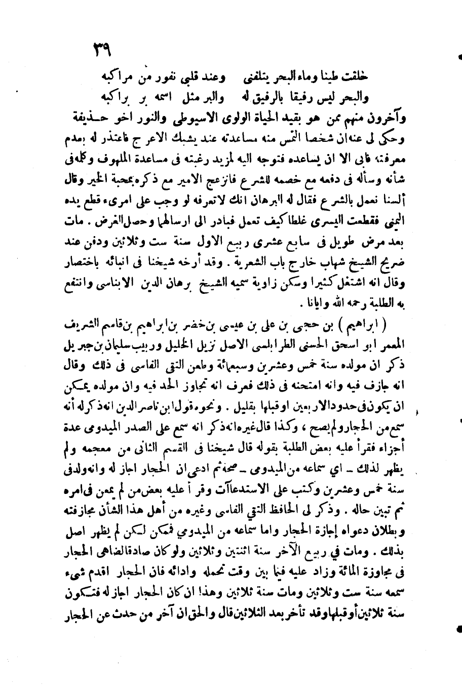 إِبْرَاهِيم بن حجي بن عَليّ بن عِيسَى بن خضر بن إِبْرَاهِيم بن قَاسم الشريف المعمر أَبُو اسحق الحسني الطرابلسي الأَصْل نزيل الْخَلِيل وربيب سُلَيْمَان بن جِبْرِيل ذكر ان مولده سنة خمس وَعشْرين وَسَبْعمائة وَطعن التقى الفاسي فِي ذَلِك وَقَالَ أَنه جازف فِيهِ وَأَنه امتحنه فِي ذَلِك فَعرف أَنه تجَاوز الْحَد فِيهِ وَأَن مولده يُمكن أَن يكون فِي حُدُود الْأَرْبَعين أَو)