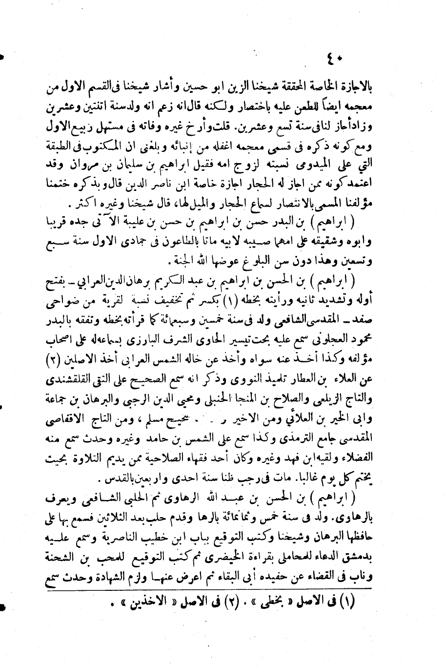بالاجازة الْخَاصَّة المحققة شَيخنَا الزين أَبُو حُسَيْن وَأَشَارَ شَيخنَا فِي الْقسم الأول من مُعْجَمه أَيْضا لِلطَّعْنِ عَلَيْهِ بِاخْتِصَار وَلكنه قَالَ أَنه رغم أَنه ولد سنة اثْنَتَيْنِ وَعشْرين وَزَاد أجَاز لنا فِي سنة تسع وَعشْرين. قلت وأرخ غَيره وَفَاته فِي مستهل ربيع الأول وَمَعَ كَونه ذكره فِي قسمي مُعْجَمه أغفله من إنبائه وَبَلغنِي أَن الْمَكْتُوب فِي الطَّبَقَة الَّتِي على الْمَيْدُومِيُّ نسبته لزوج أمه فَقيل إِبْرَاهِيم بن سُلَيْمَان بن مَرْوَان وَقد اعْتمد كَونه مِمَّن أجَاز لَهُ الحجار إجَازَة خَاصَّة ابْن نَاصِر الدّين قَالَ وبذكره ختمنا مؤلفنا الْمُسَمّى بالانتصار لسَمَاع الحجار والميل لَهَا قَالَ شَيخنَا وَغَيره أَكثر.