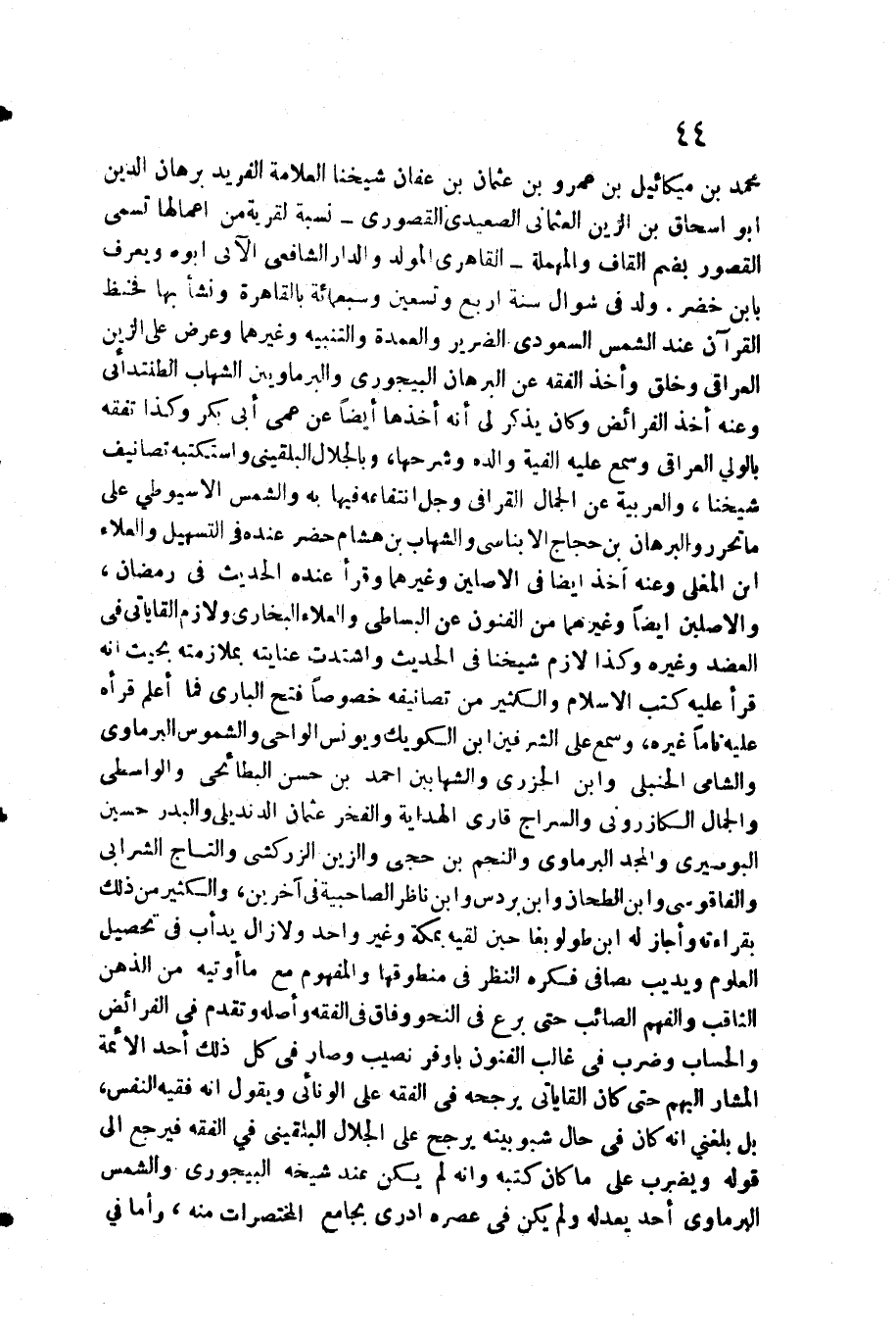 وَصَارَ فِي كل ذَلِك أحد الْأَئِمَّة الْمشَار إِلَيْهِم حَتَّى كَانَ القاياتي يرجحه فِي الْفِقْه على الونائي وَيَقُول أَنه فَقِيه النَّفس بل بَلغنِي أَنه كَانَ فِي حَال شبوبيته يرجح على الْجلَال البُلْقِينِيّ فِي الْفِقْه فَيرجع إِلَى قَوْله وَيضْرب على مَا كَانَ كتبه وَأَنه لم يكن عِنْد شَيْخه البيجوري وَالشَّمْس الْبرمَاوِيّ أحد يعدله وَلم يكن فِي عصره أدرى بِجَامِع المختصرات مِنْهُ وَأما فِي