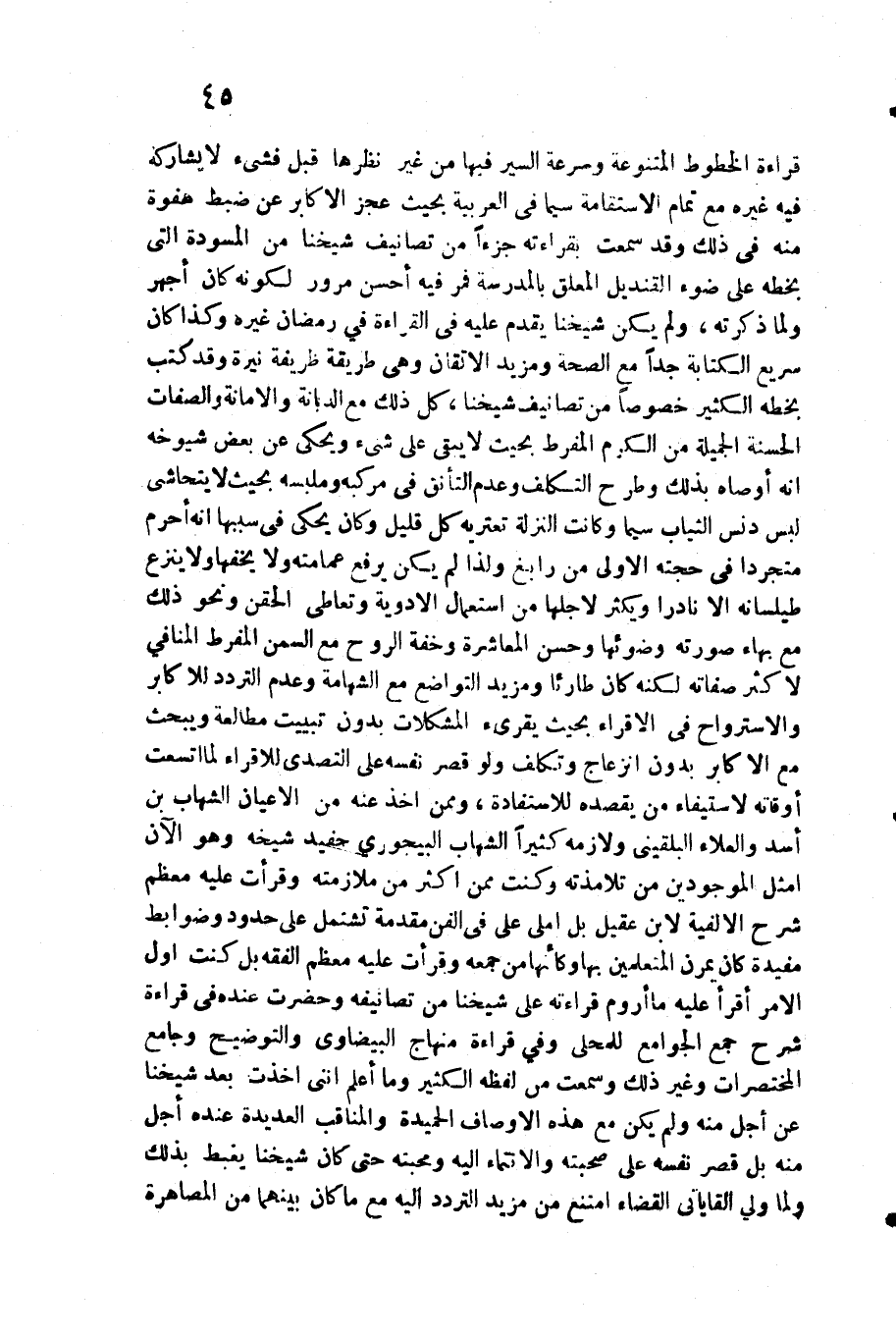 قِرَاءَة الخطوط المتنوعة وَسُرْعَة السّير فِيهَا من غير نظرها قبل فشيء لَا يُشَارِكهُ فِيهِ غَيره مَعَ تَمام الاسْتقَامَة سِيمَا فِي الْعَرَبيَّة بِحَيْثُ عجز الأكابر عَن ضبط هفوة مِنْهُ فِي ذَلِك وَقد سَمِعت بقرَاءَته جُزْءا من تصانيف شَيخنَا من المسودة الَّتِي بِخَطِّهِ على ضوء الْقنْدِيل الْمُعَلق بِالْمَدْرَسَةِ فَمر فِيهِ أحسن مُرُور لكَونه كَانَ أَجْهَر وَلما ذكرته وَلم يكن شَيخنَا يقدم عَلَيْهِ فِي الْقِرَاءَة فِي رَمَضَان غَيره وَكَذَا كَانَ سريع الْكِتَابَة جدا مَعَ الصِّحَّة ومزيد الاتقان وَهِي طَريقَة ظريفة نيرة وَقد كتب بِخَطِّهِ الْكثير خُصُوصا من تصانيف شَيخنَا كل ذَلِك مَعَ الدّيانَة وَالْأَمَانَة وَالصِّفَات الْحَسَنَة الجميلة من الْكَرم المفرط بِحَيْثُ لَا يبقي على شَيْء ويحكى عَن بعض شُيُوخه أَنه أوصاه بذلك وَطرح التَّكَلُّف وَعدم التأنق فِي مركبه وملبسه بِحَيْثُ لَا يتحاشى لبس دنس الثِّيَاب سِيمَا وَكَانَت النزلة تعتريه كل قَلِيل وَكَانَ يحْكى فِي سَببهَا أَنه أحرم متجردا فِي حجَّته الأولى من رابغ وَلذَا لم يكن يرفع عمَامَته وَلَا يخفها وَلَا ينْزع طيلسانه إِلَّا نَادرا وَيكثر لأَجلهَا من اسْتِعْمَال الْأَدْوِيَة وتعاطي الحقن وَنَحْو ذَلِك مَعَ بهاء صورته وضوئها وَحسن المعاشرة وخفة الرّوح مَعَ السّمن المفرط الْمنَافِي لأكْثر صِفَاته لكنه كَانَ طارئا ومزيد التَّوَاضُع مَعَ الشهامة وَعدم التَّرَدُّد للأكابر والاسترواح فِي الاقراء بِحَيْثُ يقرىء المشكلات بِدُونِ تبييت مطالعة ويبحث مَعَ الأكابر بِدُونِ انزعاج وتكلف وَلَو قصر نَفسه على التصدي للاقراء لما اتسعت أوقاته لِاسْتِيفَاء من يَقْصِدهُ للاستفادة وَمِمَّنْ أَخذ عَنهُ من الْأَعْيَان الشهَاب بن أَسد والْعَلَاء البُلْقِينِيّ ولازمه كثيرا الشهَاب البيجوري حفيد شَيْخه وَهُوَ الْآن أمثل الْمَوْجُودين من تلامذته وَكنت مِمَّن أَكثر من ملازمته وقرأت عَلَيْهِ مُعظم شرح الألفيه لِابْنِ عقيل بل أمْلى عَليّ فِي الْفَنّ مُقَدّمَة تشْتَمل على حُدُود وضوابط مفيدة كَانَ يمرن المتعلمين بهَا وَكَأَنَّهَا من جُمُعَة وقرأت عَلَيْهِ مُعظم الْفِقْه بل كنت أول الْأَمر أَقرَأ عَلَيْهِ مَا أروم قِرَاءَته على شَيخنَا من تصانيفه وَحَضَرت عِنْده فِي قِرَاءَة شرح جمع الْجَوَامِع للمحلي وَفِي قِرَاءَة منهاج الْبَيْضَاوِيّ والتوضيح وجامع المختصرات وَغير ذَلِك وَسمعت من لَفظه الْكثير وَمَا أعلم أنني أخذت بعد شَيخنَا عَن أجل)