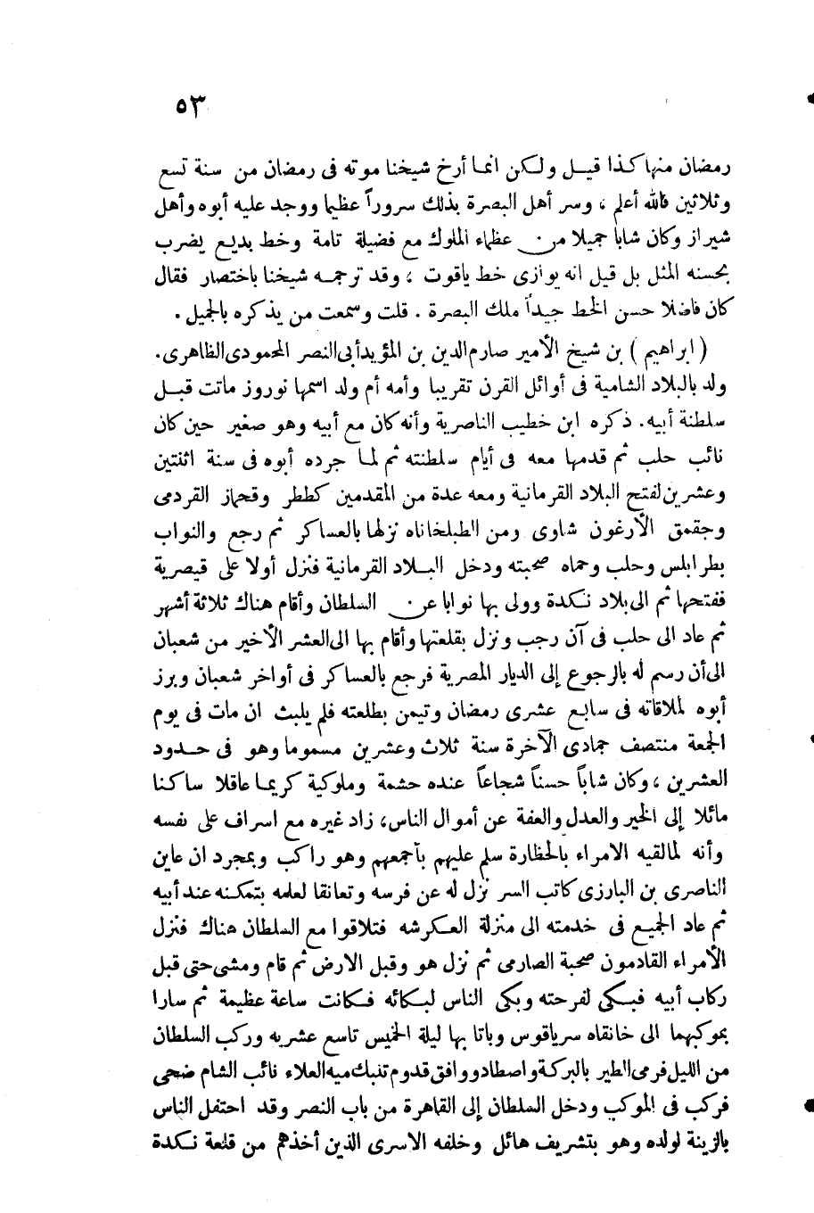 فَالله أعلم وسر أهل الْبَصْرَة بذلك سُرُورًا عَظِيما وَوجد عَلَيْهِ أَبوهُ وَأهل شيراز وَكَانَ شَابًّا جميلا من عُظَمَاء الْمُلُوك مَعَ فَضِيلَة تَامَّة وَخط بديع يضْرب بحسنه الْمثل بل قيل انه يوازي خطّ ياقوت وَقد تَرْجمهُ شَيخنَا بِاخْتِصَار فَقَالَ كَانَ فَاضلا حسن الْخط جيدا ملك الْبَصْرَة. قلت وَسمعت من يذكرهُ بالجميل.