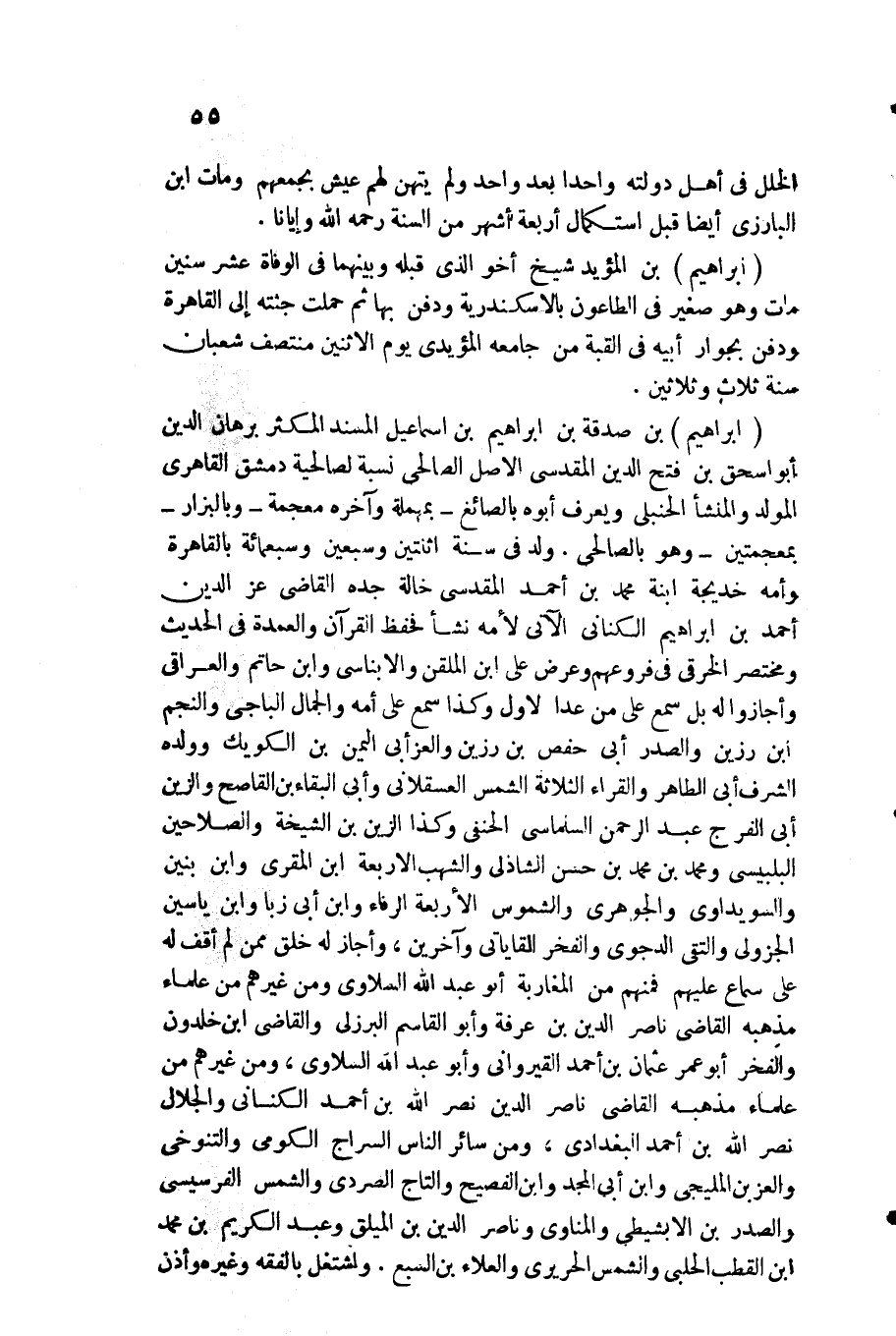 إِبْرَاهِيم بن صَدَقَة بن إِبْرَاهِيم بن اسماعيل الْمسند المكثر برهَان الدّين أَبُو اسحق بن فتح الدّين الْمَقْدِسِي الأَصْل الصَّالِحِي نِسْبَة لصالحية دمشق القاهري المولد والمنشأ الْحَنْبَلِيّ وَيعرف أَبوهُ بالصائغ بِمُهْملَة وَآخره مُعْجمَة وبالبزار بمعجمتين وَهُوَ بالصالحي. ولد فِي سنة اثْنَتَيْنِ وَسبعين وَسَبْعمائة بِالْقَاهِرَةِ وَأمه خَدِيجَة ابْنة مُحَمَّد بن أَحْمد الْمَقْدِسِي خَالَة جده القَاضِي عز الدّين أَحْمد بن إِبْرَاهِيم الْكِنَانِي الْآتِي لأمه نَشأ فحفظ الْقُرْآن والعمدة فِي الحَدِيث ومختصر الْخرقِيّ فِي فروعهم وَعرض على ابْن الملقن والابناسي وَابْن حَاتِم والعراقي وأجازوا لَهُ بل سمع على من عدا لاول وَكَذَا سمع على أمه وَالْجمال الْبَاجِيّ والنجم ابْن رزين والصدر أبي حَفْص بن رزين والعزأبي الْيمن بن الكويك وَولده الشّرف أبي الطَّاهِر والقراء الثَّلَاثَة الشَّمْس الْعَسْقَلَانِي وَأبي الْبَقَاء بن القاصح والزين أبي الْفرج عبد الرَّحْمَن السلماسي الْحَنَفِيّ وَكَذَا الزين بن الشيخة والصلاحين البلبيسي وَمُحَمّد بن مُحَمَّد بن حسن الشاذلي والشهب الْأَرْبَعَة ابْن الْمقري وَابْن بَنِينَ والسويداوي والجوهري والشموس الْأَرْبَعَة الرفاء وَابْن أبي زبا وَابْن ياسين الْجُزُولِيّ والتقى الدجوي وَالْفَخْر القاياتي وَآخَرين وَأَجَازَ لَهُ خلق مِمَّن لم أَقف لَهُ على سَماع عَلَيْهِم فَمنهمْ من المغاربة أَبُو عبد الله السلاوي وَمن غَيرهم من عُلَمَاء مذْهبه القَاضِي نَاصِر الدّين بن عَرَفَة وَأَبُو الْقَاسِم الْبُرْزُليّ وَالْقَاضِي ابْن خلدون وَالْفَخْر أَبُو عمر عُثْمَان بن أَحْمد القيرواني وَأَبُو عبد الله السلاوي وَمن غَيرهم من عُلَمَاء مذْهبه القَاضِي نَاصِر الدّين نصر الله بن أَحْمد الْكِنَانِي والجلال نصر الله بن أَحْمد الْبَغْدَادِيّ وَمن سَائِر النَّاس السراج الكومي والتنوخي والعز بن المليجي وَابْن أبي الْمجد وَابْن الفصيح والتاج الصردي وَالشَّمْس الفرسيسي والصدر بن الابشيطي والمناوي وناصر الدّين بن الميلق وعبد الكريم بن مُحَمَّد ابْن القطب الْحلَبِي وَالشَّمْس الحريري والْعَلَاء بن السَّبع. واشتغل بالفقه وَغَيره وَأذن