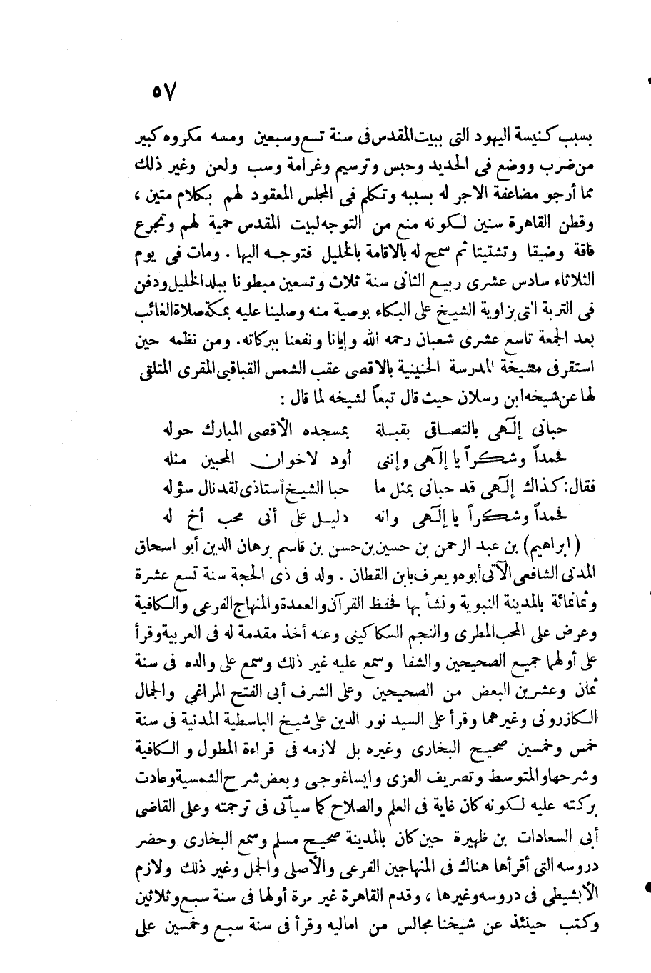 بِسَبَب كَنِيسَة الْيَهُود الَّتِي بِبَيْت الْمُقَدّس فِي سنة تسع وَسبعين ومسه مَكْرُوه كَبِير من ضرب وَوضع فِي الْحَدِيد وَحبس وترسيم وغرامة وَسَب وَلعن وَغير ذَلِك مِمَّا أَرْجُو مضاعفة الْأجر لَهُ بِسَبَبِهِ وَتكلم فِي الْمجْلس الْمَعْقُود لَهُم بِكَلَام متين وقطن الْقَاهِرَة سِنِين لكَونه منع من التَّوَجُّه لبيت الْمُقَدّس حمية لَهُم وتجرع فاقة وضيقا وتشتيتا ثمَّ سمح لَهُ بالاقامة بالخليل فَتوجه)