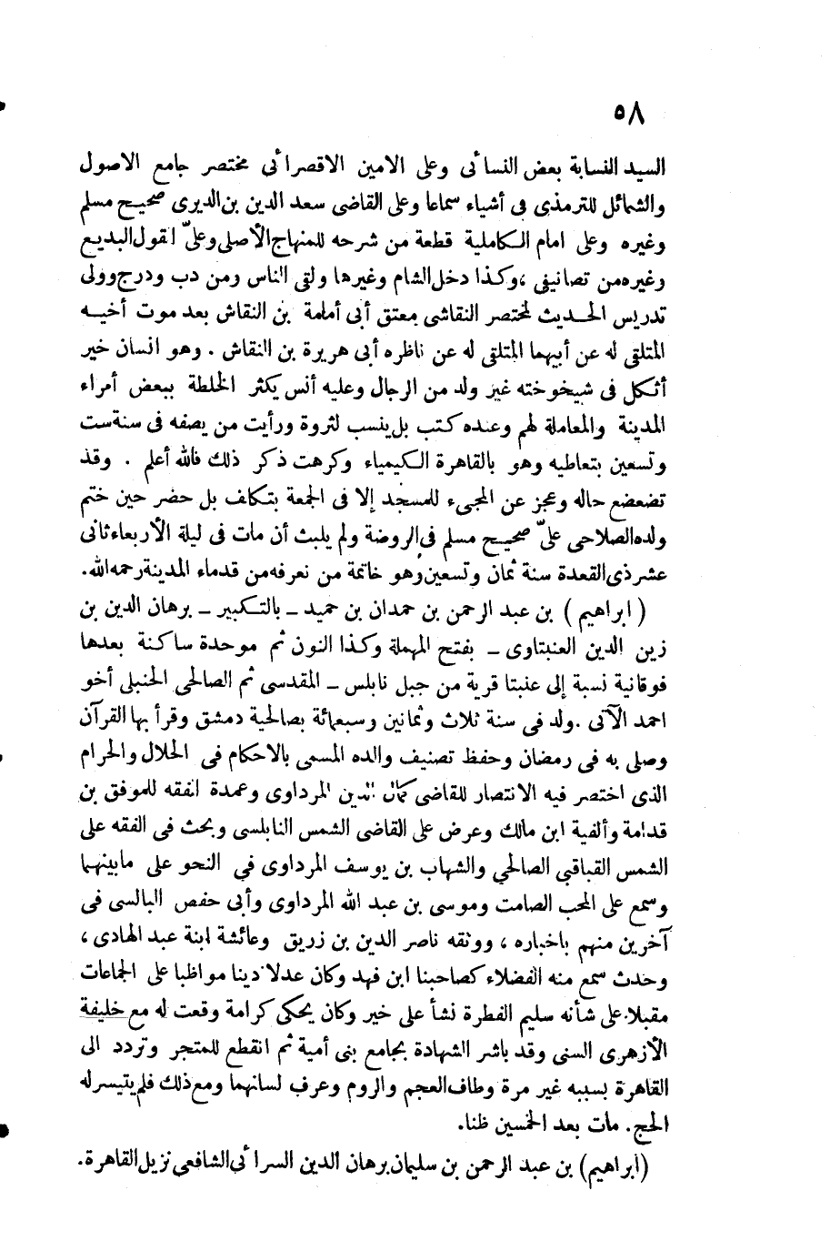 البديع وَغَيره من تصانيفي وَكَذَا دخل الشَّام وَغَيرهَا وَلَقي النَّاس وَمن دب ودرج وَولي تدريس الحَدِيث لمختصر النقاشي مُعتق أبي أُمَامَة بن النقاش بعد موت أَخِيه المتلقي لَهُ عَن أَبِيهِمَا المتلقي لَهُ عَن ناظره أبي هُرَيْرَة بن النقاش. وَهُوَ إِنْسَان خير أثكل فِي شيخوخته غير ولد من الرِّجَال وَعَلِيهِ أنس يكثر الْخلطَة بِبَعْض أُمَرَاء الْمَدِينَة والمعاملة لَهُم وَعِنْده كتب بل ينْسب لثروة وَرَأَيْت من يصفه فِي سنة سِتّ وَتِسْعين بتعاطيه وَهُوَ بِالْقَاهِرَةِ الكيمياء وكرهت ذكر ذَلِك فَالله أعلم. وَقد تضعضع حَاله وَعجز عَن الْمَجِيء لِلْمَسْجِدِ إِلَّا فِي الْجُمُعَة بتكلف بل حضر حِين ختم وَلَده الصلاحي عَليّ صَحِيح مُسلم فِي الرَّوْضَة وَلم يلبث أَن مَاتَ فِي لَيْلَة الْأَرْبَعَاء ثَانِي عشر ذِي الْقعدَة سنة ثَمَان وَتِسْعين وَهُوَ خَاتِمَة من نعرفه من قدماء الْمَدِينَة رَحمَه الله.