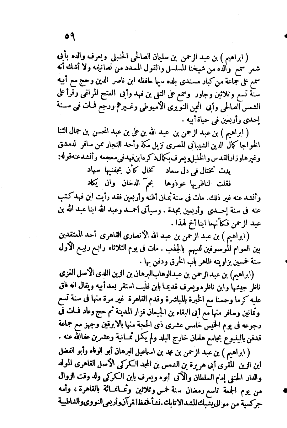 إِبْرَاهِيم بن عبد الرَّحْمَن بن سُلَيْمَان الصَّالِحِي الْحَنْبَلِيّ وَيعرف وَالِده بِأبي شعر سمع وَالِده من شَيخنَا المسلسل وَالْقَوْل المسدد من تصانيفه وَلَا أَشك أَنه سمع على جمَاعَة من كبار مسندي بَلَده سِيمَا حافظه ابْن نَاصِر الدّين وَحج مَعَ أَبِيه سنة تسع وَثَلَاثِينَ وجاور وَسمع على التقي بن
