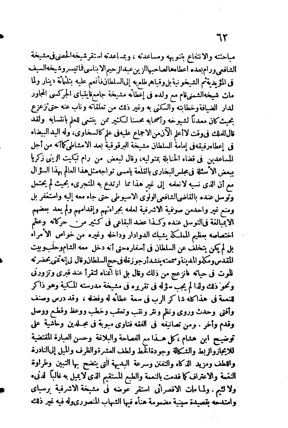 إِعْطَائِهِ مشيخة جَامع قايتباي الجركسي المجاور لدار الضِّيَافَة وخطابته والسكني بِهِ وَغير ذَلِك من تعلقاته وناب عَنهُ حَتَّى تزعزع بِحَيْثُ كَانَ معدنا لشيوخه وَأَصْحَابه محسنا لكثير مِمَّن ينتمي للْعلم بانتسابه وَلَقَد قَالَ للْملك فِي وَقت لَا أعلم الْآن من الاجماع عَلَيْهِ فِي علم كالسخاوي وَله الْيَد الْبَيْضَاء فِي إِعْطَاء رَفِيقه فِي إِمَامَة السُّلْطَان مشيخة البرقوقية بعد الامشاطي كَمَا أَنه من أجل المساعدين فِي قَضَاء الْحَنَابِلَة بمتوليه وَقَالَ لبَعض من رام تبكيت الزيني زَكَرِيَّا بِبَعْض الأسئلة فِي مجْلِس البُخَارِيّ بالقلعة يَا مسي تواجه مثل هَذَا الْعَالم بِهَذَا السُّؤَال مَعَ أَن الَّذِي نَسيَه لَا نعلمهُ إِلَى غير هَذَا مِمَّا ارتدع بِهِ المتجرئ بِحَيْثُ لم يحْتَمل وتوسل عِنْده بِالْقَاضِي الشَّافِعِي الولوي الاسيوطي حَتَّى جَاءَ مَعَه إِلَيْهِ واستغفر بل وَمنع غير وَاحِد من صوفية الاشرفية لعلمه بجراءتهم وإقدامهم وَلم يعد بَعضهم الا بمبالغة فِي التوسل عِنْده وَكَذَا عضد البقاعي فِي كثير من حركاته وَعظم اخْتِصَاصه بعظيم المملكة يشبك الدوادار وداخله وَغَيره من خَواص الْأُمَرَاء بل لم يكن يتَخَلَّف عَن السُّلْطَان فِي أَسْفَاره حَتَّى أَنه دخل مَعَه الشَّام وحلب وَبَيت الْمُقَدّس وَمَكَّة وَالْمَدينَة وسمعته ينشد أرجوزة لَهُ فِي حج السُّلْطَان وَقَالَ لي إِنَّه تمنى بِحَضْرَتِهِ الْمَوْت فِي حَيَاته فانزعج من ذَلِك وَقَالَ بل انا اتمناه لتقرأ عِنْد قَبْرِي وتزورني وَنَحْو ذَلِك وَلذَا لم يجب سُؤَاله فِي تَقْرِيره فِي مشيخة مدرسته المكية وَهُوَ ذَاكر للنعمة فِي هَذَا كُله شَاكر الرب فِي سَعَة عطائه لَهُ وفضله وَقد درس وصنف وَأفْتى وَحدث وروى ونظم ونثر ونقب وَتعقب وخطب وَوعظ وَقطع وَوصل وَقدم وَأخر. وَمن تصانيفه فِي الْفِقْه فَتَاوَى مبوبة فِي مجلدين وحاشية على توضيح ابْن هِشَام كل هَذَا مَعَ الفصاحة والبلاغة وَحسن الْعبارَة الْمُقْتَضِيَة للايجاز والربط والشكالة وجودة الْخط ولطف الْعشْرَة والظرف والميل إِلَى النادرة واللطف ومزيد الذكاء والتفنن وَسُرْعَة البديهة الَّتِي يَتَّضِح بهَا التبين وطراوة النغمة وَالِاعْتِرَاف كَمَا قدمت بِالنعْمَةِ والطبع الْمُسْتَقيم الَّذِي لَا يمِيل بِهِ غَالِبا لدنيء وَلَا لئيم. وَلما مَاتَ الاقصرائي اسْتَقر عوضه فِي مشيخة الاشرفية برسباي وامتدحه بقصيدة سينية مَضْمُومَة هنأه فِيهَا الشهَاب المنصوري وَله فِيهِ غير ذَلِك