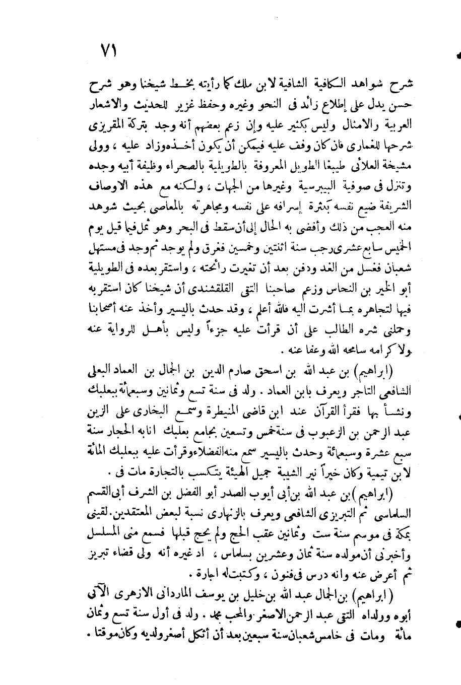 شرح شَوَاهِد الكافية الشافية لِابْنِ ملك كَمَا رَأَيْته بِخَط شَيخنَا وَهُوَ شرح حسن يدل على اطلَاع زَائِد فِي النَّحْو وَغَيره وَحفظ غزير للْحَدِيث والاشعار الْعَرَبيَّة والأمثال وَلَيْسَ بِكَثِير عَلَيْهِ وان زعم بَعضهم أَنه وجد بتركة المقريزي شرحها للغماري فان كَانَ وقف عَلَيْهِ فَيمكن أَن يكون أَخذه وَزَاد عَلَيْهِ وَولي مشيخة العلائي طيبغا الطَّوِيل الْمَعْرُوفَة بالطويلية بالصحراء وَظِيفَة أَبِيه وجده وتنزل فِي صوفية البيبرسية وَغَيرهَا من الْجِهَات وَلكنه مَعَ هَذِه الْأَوْصَاف الشَّرِيفَة ضيع نَفسه بِكَثْرَة إسرافه على نَفسه ومجاهرته بِالْمَعَاصِي بِحَيْثُ شوهد مِنْهُ الْعجب من ذَلِك وأفضى بِهِ الْحَال إِلَى أَن سقط فِي الْبَحْر وَهُوَ ثمل فِيمَا قيل يَوْم الْخَمِيس سَابِع عشري رَجَب سنة اثْنَتَيْنِ وَخمسين فغرق وَلم يُوجد ثمَّ وجد فِي مستهل شعْبَان فَغسل من الْغَد وَدفن بعد أَن تَغَيَّرت رَائِحَته وَاسْتقر بعده فِي)