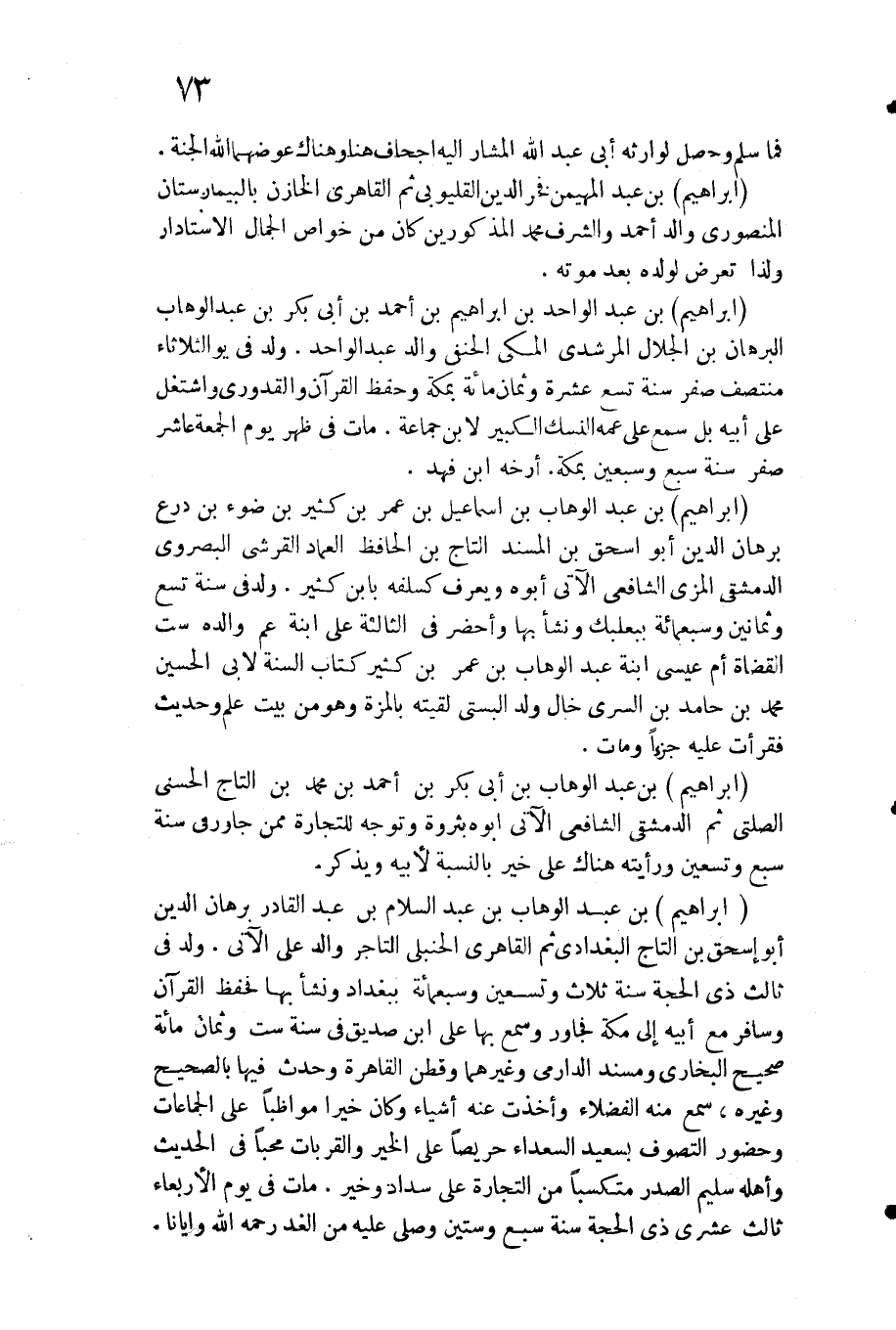 إِبْرَاهِيم بن عبد الْوَهَّاب بن عبد السَّلَام بن عبد الْقَادِر برهَان الدّين أَبُو إِسْحَاق بن التَّاج الْبَغْدَادِيّ ثمَّ القاهري الْحَنْبَلِيّ التَّاجِر وَالِد عَليّ الْآتِي. ولد فِي ثَالِث ذِي الْحجَّة سنة ثَلَاث وَتِسْعين وَسَبْعمائة بِبَغْدَاد وَنَشَأ بهَا فحفظ الْقُرْآن وسافر مَعَ أَبِيه إِلَى مَكَّة فجاور وَسمع بهَا على ابْن صديق فِي سنة سِتّ وثمان مائَة صَحِيح البُخَارِيّ ومسند الدَّارمِيّ وَغَيرهمَا وقطن الْقَاهِرَة وَحدث فِيهَا بِالصَّحِيحِ وَغَيره سمع مِنْهُ الْفُضَلَاء وَأخذت عَنهُ أَشْيَاء وَكَانَ خيرا مواظبا على الْجَمَاعَات وَحُضُور التصوف بِسَعِيد السُّعَدَاء حَرِيصًا على الْخَيْر والقربات محبا فِي الحَدِيث وَأَهله سليم الصَّدْر متكسبا من التِّجَارَة على سداد وَخير. مَاتَ فِي يَوْم الْأَرْبَعَاء ثَالِث عشرى ذِي الْحجَّة سنة سبع وَسِتِّينَ وَصلى عَلَيْهِ من الْغَد رَحمَه الله وايانا.