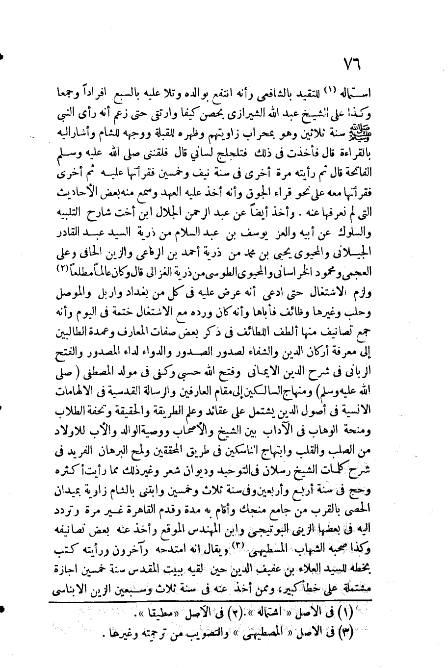 استماله للتقيد بالشافعي وَأَنه انْتفع بوالده وتلا عَلَيْهِ بالسبع أفرادا وجمعا وَكَذَا على الشَّيْخ عبد الله الشِّيرَازِيّ بحصن كيفا وارتقى حَتَّى زعم أَنه رأى النَّبِي صلى الله عَلَيْهِ وَسلم سنة ثَلَاثِينَ وَهُوَ بمحراب زاويتهم وظهره للْقبْلَة وَوَجهه للشام وَأَشَارَ إِلَيْهِ بِالْقِرَاءَةِ قَالَ فَأخذت فِي ذَلِك فتلجلج لساني قَالَ فلقنني صلى الله عَلَيْهِ وَسلم الْفَاتِحَة قَالَ ثمَّ رَأَيْته مرّة أُخْرَى فِي سنة نَيف وَخمسين فقرأتها عَلَيْهِ ثمَّ أُخْرَى فقرأتها مَعَه على نَحْو قراء الجوق وَأَنه أَخذ عَلَيْهِ الْعَهْد وَسمع مِنْهُ بعض الْأَحَادِيث الَّتِي لم نعرفها عَنهُ. وَأخذ أَيْضا عَن عبد الرَّحْمَن الْجلَال ابْن أُخْت شَارِح التَّلْبِيَة والسلوك عَن أَبِيه والعز يُوسُف بن عبد السَّلَام من ذُرِّيَّة السَّيِّد عبد الْقَادِر الجيلاني والمحيوي يحيى بن مُحَمَّد من ذُرِّيَّة أَحْمد بن الرِّفَاعِي والزين الحافي وعَلى العجمي ومحمود الْخُرَاسَانِي والمحيوي الطوسي من ذُرِّيَّة الْغَزالِيّ قَالَ وَكَانَ عَالما مطلعا وَلزِمَ الِاشْتِغَال حَتَّى ادّعى أَنه عرض عَلَيْهِ فِي كل من بَغْدَاد واربل والموصل وحلب وَغَيرهَا وظائف فأباها وَأَنه كَانَ ورده مَعَ الِاشْتِغَال ختمة فِي الْيَوْم وَأَنه جمع تصانيف مِنْهَا ألطف اللطائف فِي ذكر بعض صِفَات المعارف وعمدة الطالبين إِلَى معرفَة أَرْكَان الدّين والشفاء لصدور الصُّدُور والدواء لداء المصدور وَالْفَتْح الرباني فِي شرح الدّين الإيماني وَفتح الله حسبي وَكفى فِي مولد الْمُصْطَفى صلى الله عَلَيْهِ وَسلم ومنهاج السالكين إِلَى مقَام العارفين والرسالة القدسية فِي الإلهامات الانسية فِي أصُول الدّين يشْتَمل على عقائد وَعلم الطَّرِيقَة)