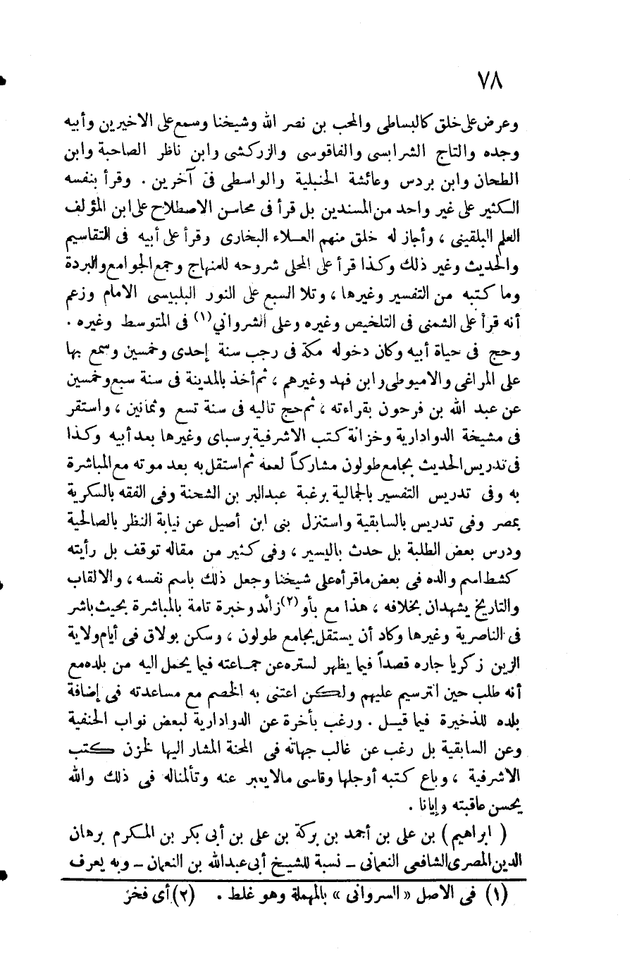 وَعرض على خلق كالبساطي والمحب بن نصر الله وَشَيخنَا وَسمع على الْأَخيرينِ وَأَبِيهِ وجده والتاج الشرابسي والفاقوسي وَالزَّرْكَشِيّ وَابْن نَاظر الصاحبة وَابْن الطَّحَّان وَابْن بردس وَعَائِشَة الحنبلية والواسطي فِي آخَرين. وَقَرَأَ بِنَفسِهِ الْكثير على غير وَاحِد من المسندين بل قَرَأَ فِي محَاسِن الِاصْطِلَاح على ابْن الْمُؤلف الْعلم البُلْقِينِيّ وَأَجَازَ لَهُ خلق مِنْهُم الْعَلَاء البُخَارِيّ وَقَرَأَ على أَبِيه فِي التقاسيم والْحَدِيث وَغير ذَلِك وَكَذَا قَرَأَ على الْمحلى شروحه للمنهاج وَجمع الْجَوَامِع والبردة وَمَا كتبه من التَّفْسِير وَغَيرهَا وتلا السَّبع على النُّور البلبيسي الإِمَام وَزعم أَنه قَرَأَ على الشمنى فِي التَّلْخِيص وَغَيره وعَلى الشرواني فِي الْمُتَوَسّط وَغَيره. وَحج فِي حَيَاة أَبِيه وَكَانَ دُخُوله مَكَّة فِي رَجَب سنة إِحْدَى وَخمسين وَسمع بهَا على المراغي والأميوطي وَابْن فَهد وَغَيرهم ثمَّ أَخذ بِالْمَدِينَةِ فِي سنة سبع وَخمسين عَن عبد الله بن فَرِحُونَ بقرَاءَته ثمَّ حج تاليه فِي سنة تسع وَثَمَانِينَ وَاسْتقر فِي مشيخة الدوادارية وخزانة كتب الأشرفية برسباي وَغَيرهَا بعد أَبِيه وَكَذَا فِي تدريس الحَدِيث بِجَامِع طولون مشاركا لِعَمِّهِ ثمَّ اسْتَقل بِهِ بعد مَوته مَعَ الْمُبَاشرَة بِهِ وَفِي تدريس التَّفْسِير بالجمالية برغبة عبد الْبر بن الشّحْنَة وَفِي الْفِقْه بالسكرية بِمصْر وَفِي تدريس بالسابقية واستنزل بني ابْن أصيل عَن نِيَابَة النّظر بالصالحية ودرس بعض الطّلبَة بل حدث باليسير وَفِي كثير من مقاله توقف بل رَأَيْته كشط اسْم وَالِده فِي بعض مَا قَرَأَهُ على شَيخنَا وَجعل ذَلِك باسم نَفسه والألقاب والتاريخ يَشْهَدَانِ بِخِلَافِهِ هَذَا مَعَ بِأَو زَائِد وخبرة تَامَّة بِالْمُبَاشرَةِ بِحَيْثُ بَاشر فِي الناصرية وَغَيرهَا وَكَاد أَن يسْتَقلّ بِجَامِع طولون وَسكن بولاق فِي أَيَّام ولَايَة الزين زَكَرِيَّا جَاره قصدا فِيمَا يظْهر لستره عَن جماعته فِيمَا يحمل إِلَيْهِ من بَلَده مَعَ أَنه طلب حِين الترسيم عَلَيْهِم وَلَكِن اعتنى بِهِ)