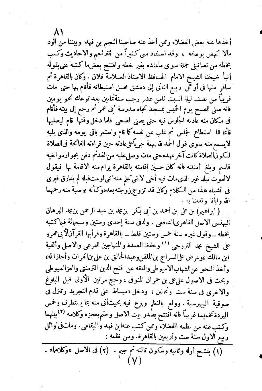 أَخذهَا عَنهُ بعض الْفُضَلَاء وَمِمَّنْ أَخذ عَنهُ صاحبنا النَّجْم بن فَهد وبيننا من الود مَالا أنهض بوصفه وَقد اسْتَفَادَ مني كثيرا من التراجم وَالْأَحَادِيث وَكتب بِخَطِّهِ من تصانيفي جملَة سوى مَا عِنْده بِغَيْر خطه وافتتح بعض مَا كتبه عني بقوله أنبأ شَيخنَا الشَّيْخ الإِمَام الْحَافِظ الْأُسْتَاذ الْعَلامَة فلَان. وَكَانَ بِالْقَاهِرَةِ ثمَّ سَافر مِنْهَا فِي أَوَائِل ربيع الثَّانِي إِلَى دمشق مَحل استيطانه فَأَقَامَ بهَا حَتَّى مَاتَ قَرِيبا من نصف لَيْلَة السبت ثامن عشر رَجَب سنة ثَمَانِينَ بعد توعك نَحْو يَوْمَيْنِ فَإِنَّهُ صلى الصُّبْح يَوْم الْخَمِيس بِمَسْجِد تجاه مدرسة أبي عمر ثمَّ رَجَعَ إِلَى بَيته فَأَقَامَ فِي مَكَان مِنْهُ عَادَته الْجُلُوس فِيهِ حَتَّى يُصَلِّي الضُّحَى فَلَمَّا دخل وَقتهَا قَامَ ليصليها قَائِما فَمَا اسْتَطَاعَ فَجَلَسَ ثمَّ غلب عَن نَفسه كَمَا قَامَ وَاسْتمرّ بَاقِي يَوْمه وَالَّذِي يَلِيهِ لَا يسمع مِنْهُ سوى قَول الْحَمد لله بهمة جَريا على عَادَته حِين قِرَاءَته الْفَاتِحَة فِي الصَّلَاة لكَون الصَّلَاة كَانَت آخر عَهده حَتَّى مَاتَ وَصلى عَلَيْهِ من الْغَد ثمَّ دفن بجوار مواخيه قَاسم وَبلغ أمْنِيته فَإِنَّهُ كَانَ حِين إِقَامَته بِالْقَاهِرَةِ يرام مِنْهُ الْإِقَامَة بهَا فَيَقُول لَا أَمُوت بِبَلَد غير الَّذِي مَاتَ فِيهِ أخي لأنني أعلم مِنْهُ أنني لَو مت قبله لم يُفَارق قَبْرِي فِي أشباه هَذَا من الْكَلَام وَكَانَ قد تزوج بِزَوْجَتِهِ بعده وَكَأَنَّهُ بِوَصِيَّة مِنْهُ رحمهمَا الله وإيانا ونفعنا بِهِ.