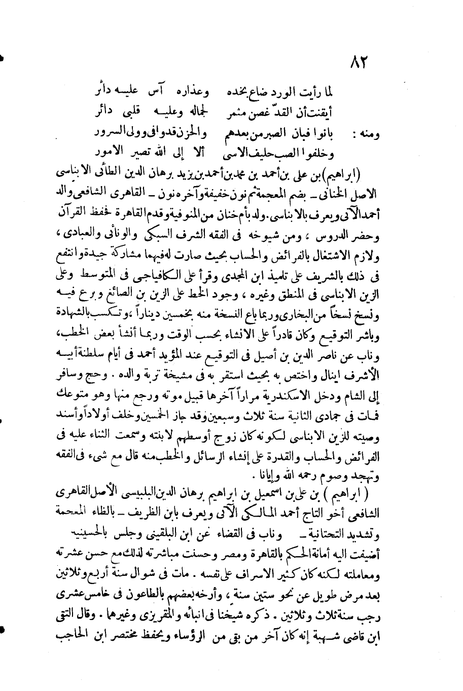 إِبْرَاهِيم بن عَليّ بن أَحْمد بن مُحَمَّد بن أَحْمد بن يزِيد برهَان الدّين الطَّائِي الأبناسي الأَصْل الخناني بِضَم الْمُعْجَمَة ثمَّ نون خَفِيفَة وَآخره نون القاهري الشَّافِعِي وَالِد أَحْمد الْآتِي وَيعرف بالأبناسي. ولد بِأم خنان من المنوفية وَقدم الْقَاهِرَة فحفظ الْقُرْآن وَحضر الدُّرُوس وَمن شُيُوخه فِي الْفِقْه الشّرف السُّبْكِيّ والونائي والعبادي ولازم الِاشْتِغَال بالفرائض والحساب بِحَيْثُ صَارَت لَهُ فيهمَا مُشَاركَة جَيِّدَة وانتفع فِي ذَلِك بالشريف على تلميذ ابْن المجدي وَقَرَأَ على الكافياجي فِي الْمُتَوَسّط وعَلى الزين الأبناسي فِي الْمنطق وَغَيره وجود الْخط على الزين بن الصَّائِغ وبرع فِيهِ وَنسخ نسخا من البُخَارِيّ وَرُبمَا بَاعَ النُّسْخَة مِنْهُ بِخَمْسِينَ دِينَارا وتكسب بِالشَّهَادَةِ وباشر التوقيع وَكَانَ قَادِرًا على الْإِنْشَاء بِحَسب الْوَقْت وَرُبمَا أنشأ بعض الْخطب وناب عَن نَاصِر الدّين بن أصيل فِي التوقيع عِنْد الْمُؤَيد أَحْمد فِي أَيَّام سلطنة أَبِيه الْأَشْرَف اينال واختص بِهِ بِحَيْثُ اسْتَقر بِهِ فِي مشيخة تربة وَالِده. وَحج وسافر إِلَى الشَّام وَدخل الاسكندرية مرَارًا آخرهَا قبيل مَوته وَرجع مِنْهَا وَهُوَ متوعك فَمَاتَ فِي جُمَادَى الثَّانِيَة سنة ثَلَاث وَسبعين وَقد جَازَ الْخمسين وَخلف أَوْلَادًا وَأسْندَ وَصيته للزين الأبناسي لكَونه كَانَ زوج أوسطهم لابنته وَسمعت الثَّنَاء عَلَيْهِ فِي الْفَرَائِض والحساب وَالْقُدْرَة على إنْشَاء الرسائل والخطب مِنْهُ قَالَ مَعَ شَيْء فِي الْفِقْه وتهجد وَصَوْم رَحمَه الله وإيانا.