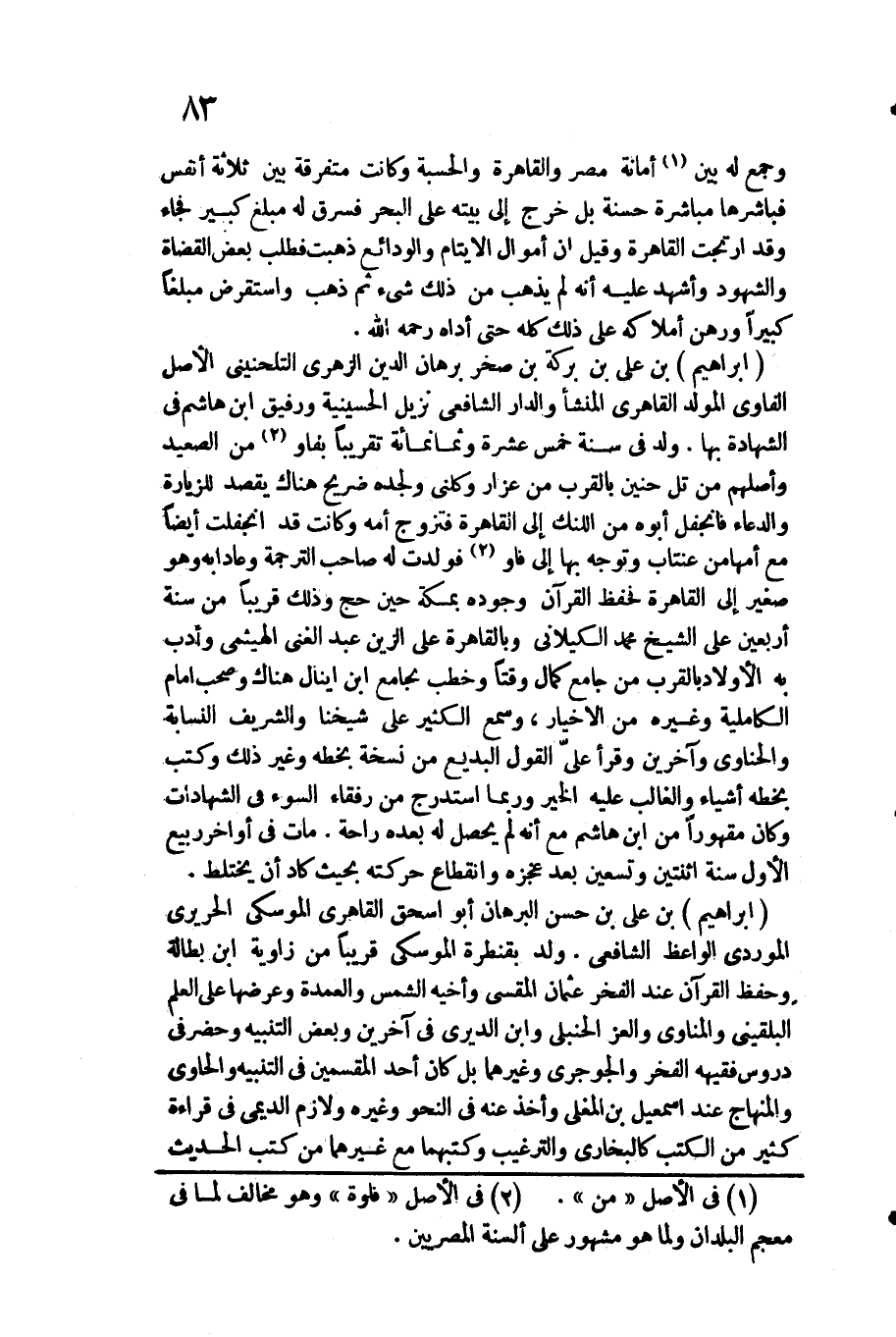 إِبْرَاهِيم بن عَليّ بن بركَة بن صَخْر برهَان الدّين الزُّهْرِيّ التلحنيني الأَصْل الفاوي المولد القاهري المنشأ وَالدَّار الشَّافِعِي نزيل الحسينية ورفيق ابْن هَاشم فِي الشَّهَادَة بهَا. ولد فِي سنة خمس عشرَة وَثَمَانمِائَة تَقْرِيبًا بفاو من الصَّعِيد وأصلهم من تل حنين بِالْقربِ من عزار وكلني ولجده ضريح هُنَاكَ يقْصد للزيارة وَالدُّعَاء فانجفل أَبوهُ من اللنك إِلَى الْقَاهِرَة فَتزَوج أمه وَكَانَت قد انجفلت أَيْضا مَعَ أمهَا من عنتاب وَتوجه بهَا إِلَى فاو فَولدت لَهُ صَاحب التَّرْجَمَة وعادا بِهِ وَهُوَ صَغِير إِلَى الْقَاهِرَة فحفظ الْقُرْآن وجوده بِمَكَّة حِين حج وَذَلِكَ قَرِيبا من سنة أَرْبَعِينَ على الشَّيْخ مُحَمَّد الكيلاني وبالقاهرة على الزين عبد الْغَنِيّ الهيثمي وأدب بِهِ الْأَوْلَاد بِالْقربِ من جَامع كَمَال وقتا وخطب بِجَامِع ابْن اينال هُنَاكَ وَصَحب إِمَام الكاملية وَغَيره من الأخيار وَسمع الْكثير على شَيخنَا والشريف النسابة والحناوي وَآخَرين وَقَرَأَ عَليّ القَوْل البديع من نُسْخَة بِخَطِّهِ وَغير ذَلِك وَكتب بِخَطِّهِ أَشْيَاء وَالْغَالِب عَلَيْهِ الْخَيْر وَرُبمَا استدرج من رُفَقَاء السوء فِي الشَّهَادَات وَكَانَ مقهورا من ابْن هَاشم مَعَ أَنه لم يحصل لَهُ بعده رَاحَة. مَاتَ فِي أَوَاخِر ربيع الأول سنة اثْنَتَيْنِ وَتِسْعين بعد عَجزه وَانْقِطَاع حركته بِحَيْثُ كَاد أَن يخْتَلط.