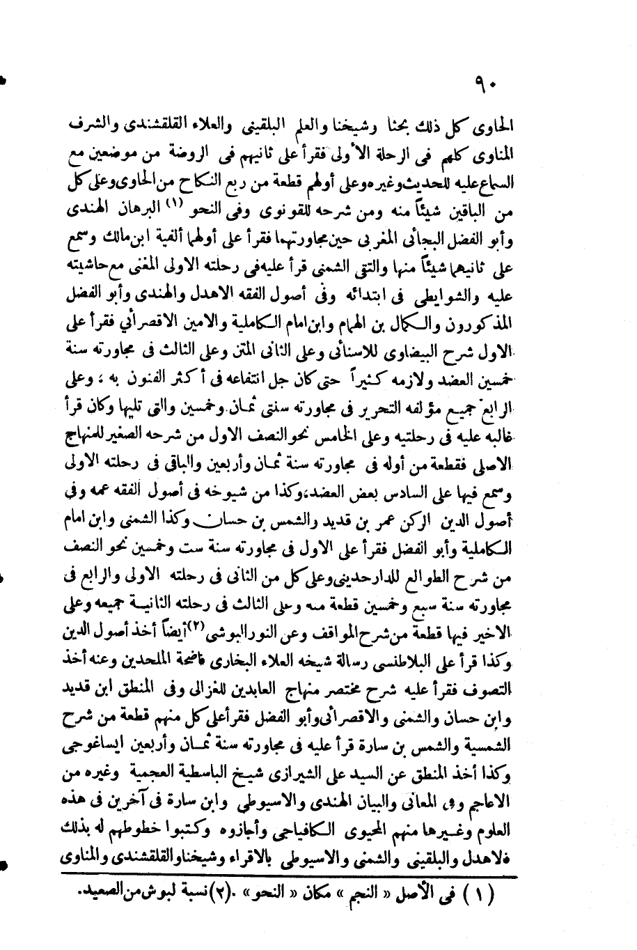 الأقصرائي فَقَرَأَ على الأول شرح الْبَيْضَاوِيّ للأسنائي وعَلى الثَّانِي الْمَتْن وعَلى الثَّالِث فِي مجاورته سنة خمسين الْعَضُد ولازمه كثيرا حَتَّى كَانَ جلّ انتفاعه فِي أَكثر الْفُنُون بِهِ وعَلى الرَّابِع جَمِيع مُؤَلفه التَّحْرِير فِي مجاورته سنتي ثَمَان وَخمسين وَالَّتِي تَلِيهَا وَكَانَ قَرَأَ غالبه عَلَيْهِ فِي رحلتيه وعَلى الْخَامِس نَحْو النّصْف الأول من شَرحه الصَّغِير للمنهاج الْأَصْلِيّ فقطعة من أَوله فِي مجاورته سنة ثَمَان وَأَرْبَعين وَالْبَاقِي فِي رحلته الأولى وَسمع فِيهَا على السَّادِس بعض الْعَضُد وَكَذَا من شُيُوخه فِي أصُول الْفِقْه عَمه وَفِي أصُول الدّين الرُّكْن عمر بن قديد وَالشَّمْس بن حسان وَكَذَا الشمني وَابْن إِمَام الكاملية وَأَبُو الْفضل فَقَرَأَ على الأول فِي مجاورته سنة سِتّ وَخمسين نَحْو النّصْف من شرح الطوالع للدارحديني وعَلى كل من الثَّانِي فِي رحلته الأولى وَالرَّابِع فِي مجاورته سنة سبع وَخمسين قِطْعَة مِنْهُ وعَلى الثَّالِث فِي رحلته الثَّانِيَة جَمِيعه وعَلى الْأَخير فِيهَا قِطْعَة من شرح المواقف وَعَن النُّور البوشي أَيْضا أَخذ أصُول الدّين وَكَذَا قَرَأَ على البلاطنسي رِسَالَة شَيْخه الْعَلَاء البُخَارِيّ فاضحة الْمُلْحِدِينَ وَعنهُ أَخذ التصوف فَقَرَأَ عَلَيْهِ شرح مُخْتَصر منهاج العابدين للغزالي وَفِي الْمنطق ابْن قديد وَابْن حسان والشمني والأقصرائي وَأَبُو الْفضل فَقَرَأَ على كل مِنْهُم قِطْعَة من شرح الشمسية وَالشَّمْس بن سارة قَرَأَ عَلَيْهِ فِي مجاورته سنة ثَمَان وَأَرْبَعين ايساغوجي وَكَذَا أَخذ الْمنطق عَن السَّيِّد عَليّ الشِّيرَازِيّ شيخ الباسطية العجمية وَغَيره من الْأَعَاجِم وَفِي الْمعَانِي وَالْبَيَان الْهِنْدِيّ والأسيوطي وَابْن سارة فِي آخَرين فِي هَذِه الْعُلُوم وَغَيرهَا مِنْهُم المحيوي الكافياجي وأجازوه وَكَتَبُوا خطوطهم لَهُ بذلك فلاهدل والبلقيني والشمني والأسيوطي بالإقراء وَشَيخنَا والقلقشندي والمناوي