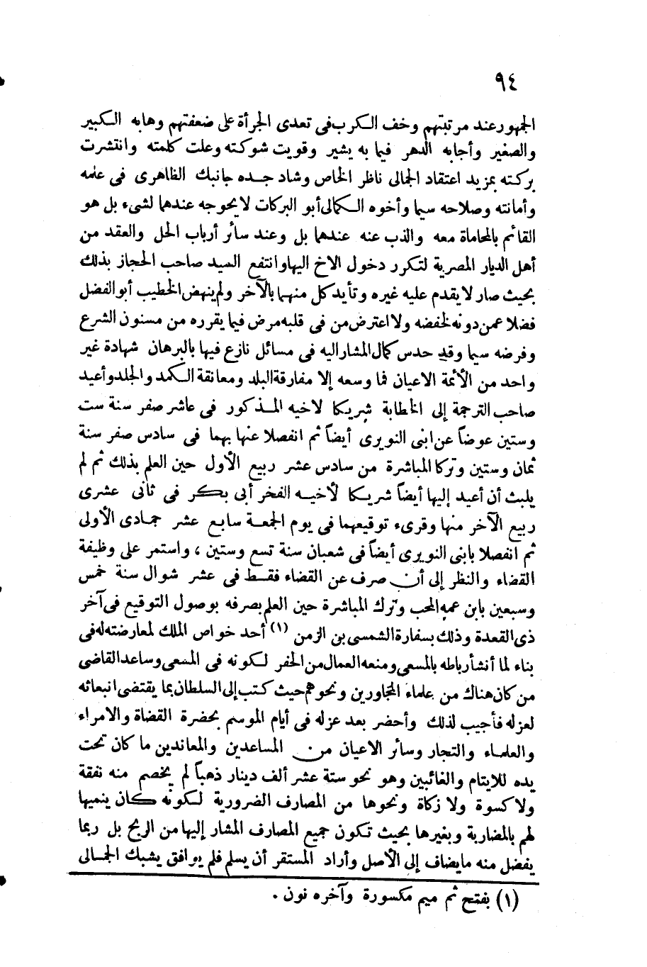 الْجُمْهُور عِنْد مرتبتهم وخف الكرب فِي تعدِي الجرأة على ضعفتهم وهابه الْكَبِير وَالصَّغِير وأجابه الدَّهْر فِيمَا بِهِ يُشِير وقويت شوكته وعلت كَلمته وانتشرت بركته بمزيد اعْتِقَاد الجمالي نَاظر الْخَاص وشاد جده جَانِبك الظَّاهِرِيّ فِي علمه وأمانته وصلاحه سِيمَا وَأَخُوهُ الكمالي أَبُو البركات لَا يحوجه عِنْدهمَا لشَيْء بل هُوَ الْقَائِم بالمحاماة مَعَه والذب عَنهُ عِنْدهمَا بل وَعند سَائِر أَرْبَاب الْحل وَالْعقد من أهل الديار المصرية لتكرر دُخُول الْأَخ إِلَيْهَا وانتفع السَّيِّد صَاحب الْحجاز بذلك بِحَيْثُ صَار لَا يقدم عَلَيْهِ غَيره وتأيد كل مِنْهُمَا بِالْآخرِ وَلم ينْهض الْخَطِيب أَبُو الْفضل فضلا عَمَّن دونه لخفضه وَلَا اعْترض من فِي قلبه مرض فِيمَا يقرره من مسنون الشَّرْع وفرضه سِيمَا وَقد حدس كَمَال الْمشَار إِلَيْهِ فِي مسَائِل نَازع فِيهَا بالبرهان شَهَادَة غير وَاحِد من الْأَئِمَّة الْأَعْيَان فَمَا وَسعه إِلَّا مُفَارقَة الْبَلَد ومعانقة الكمد وَالْجَلد وأعيد صَاحب التَّرْجَمَة إِلَى الخطابة شَرِيكا لِأَخِيهِ الْمَذْكُور فِي عَاشر صفر سنة سِتّ وَسِتِّينَ عوضا عَن ابْني)
