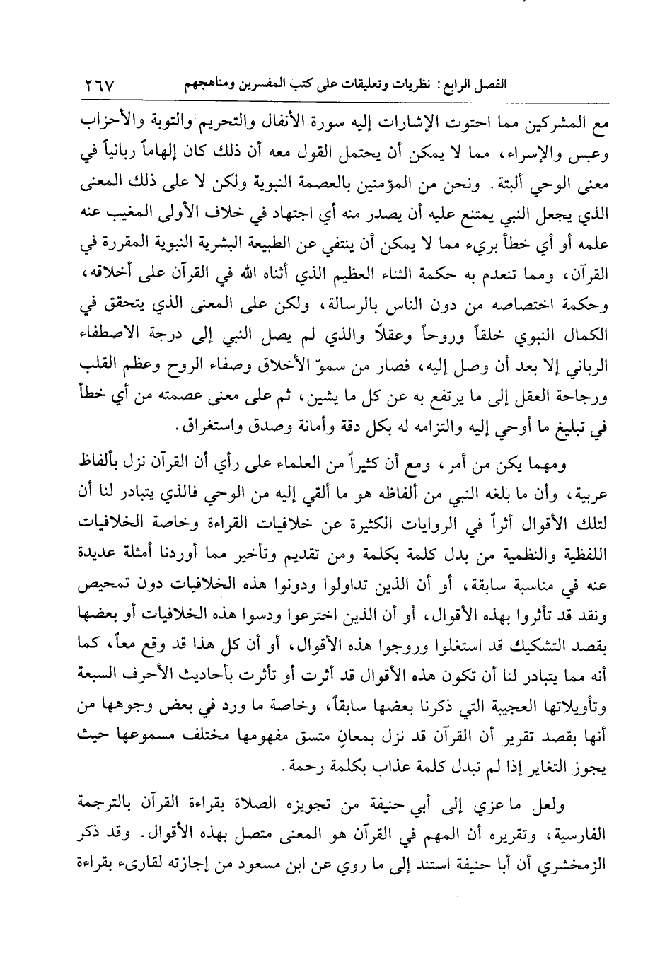 ولعل ما عزي إلى أبي حنيفة من تجويزه الصلاة بقراءة القرآن بالترجمة الفارسية، وتقريره أن المهم في القرآن هو المعنى متصل بهذه الأقوال. وقد ذكر الزمخشري أن أبا حنيفة استند إلى ما روي عن ابن مسعود من إجازته لقارىء بقراءة
