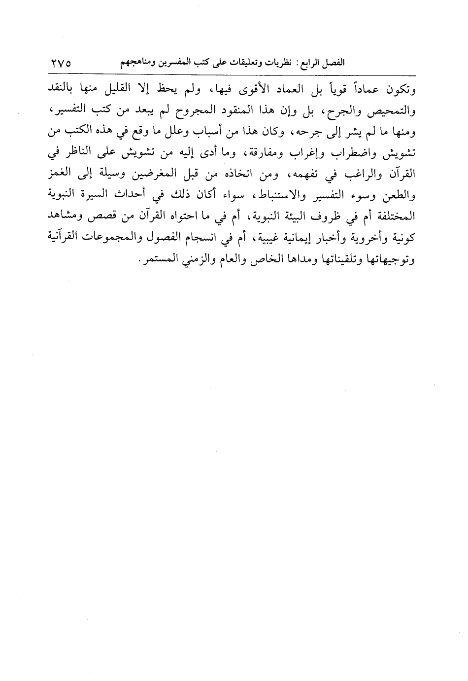 وتكون عمادا قويا بل العماد الأقوى فيها، ولم يحظ إلا القليل منها بالنقد والتمحيص والجرح، بل وإن هذا المنقود المجروح لم يبعد من كتب التفسير، ومنها ما لم يشر إلى جرحه، وكان هذا من أسباب وعلل ما وقع في هذه الكتب من تشويش واضطراب وإغراب ومفارقة، وما أدى إليه من تشويش على الناظر في القرآن والراغب في تفهمه، ومن اتخاذه من قبل المغرضين وسيلة إلى الغمز والطعن وسوء التفسير والاستنباط، سواء أكان ذلك في أحداث السيرة النبوية المختلفة أم في ظروف البيئة النبوية، أم في ما احتواه القرآن من قصص ومشاهد كونية وأخروية وأخبار إيمانية غيبية، أم في انسجام الفصول والمجموعات القرآنية وتوجيهاتها وتلقيناتها ومداها الخاص والعام والزمني المستمر.