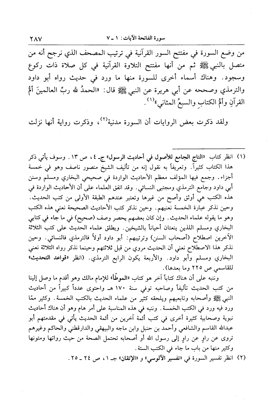 (1) انظر كتاب «التاج الجامع للأصول في أحاديث الرسول» ج- 4، ص 13. وسوف يأتي ذكر هذا الكتاب كثيرا. وتعريفا به نقول إنه من تأليف الشيخ منصور ناصف وهو في خمسة أجزاء. وجمع فيها المؤلف معظم الأحاديث الواردة في صحيحي البخاري ومسلم وسنن أبي داود وجامع الترمذي ومجتبى النسائي. وقد اتفق العلماء على أن الأحاديث الواردة في هذه الكتب هي أوثق وأصح من غيرها وتعتبر عندهم الطبقة الأولى من كتب الحديث.